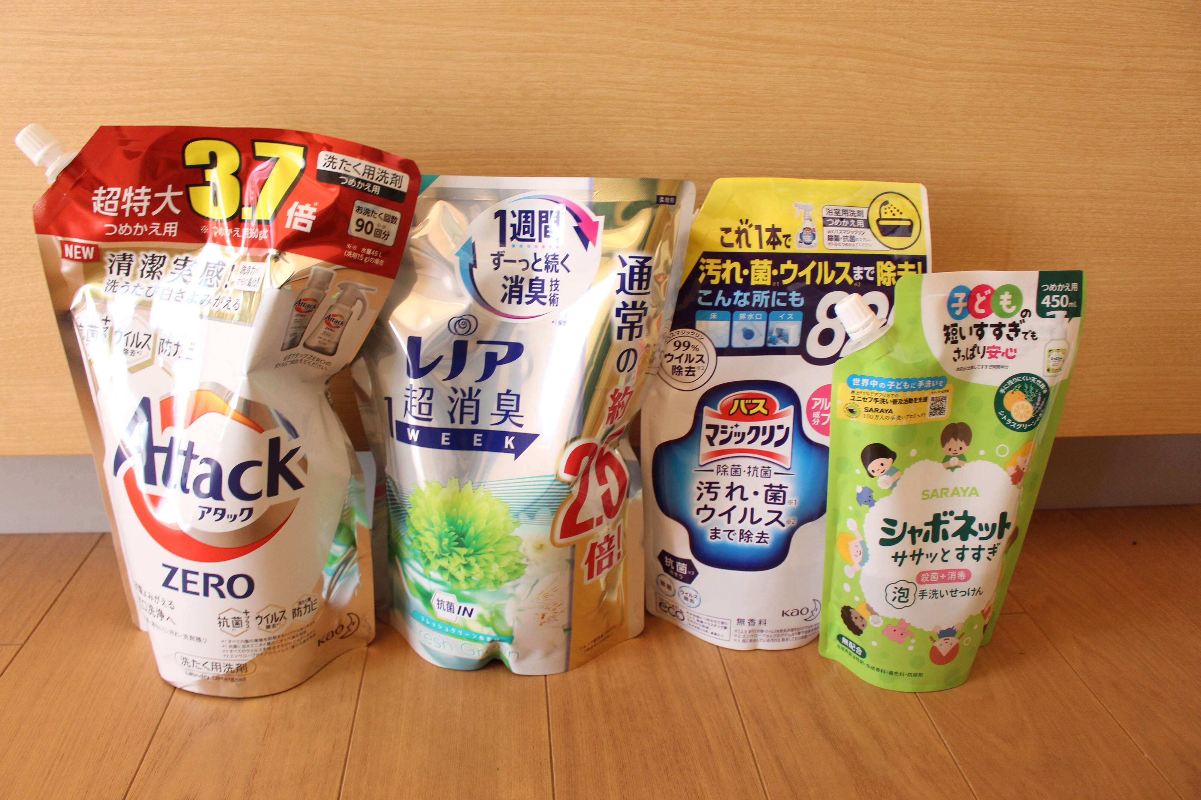 お風呂、キッチン、洗濯や掃除で使う洗剤は大容量サイズの詰め替えを購入するのが、わが家の定番となりました。