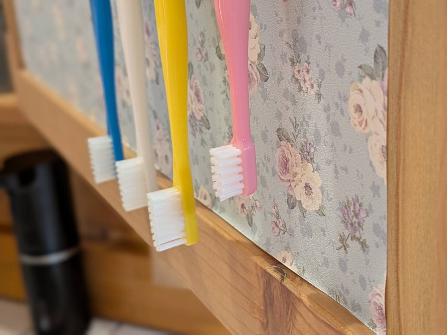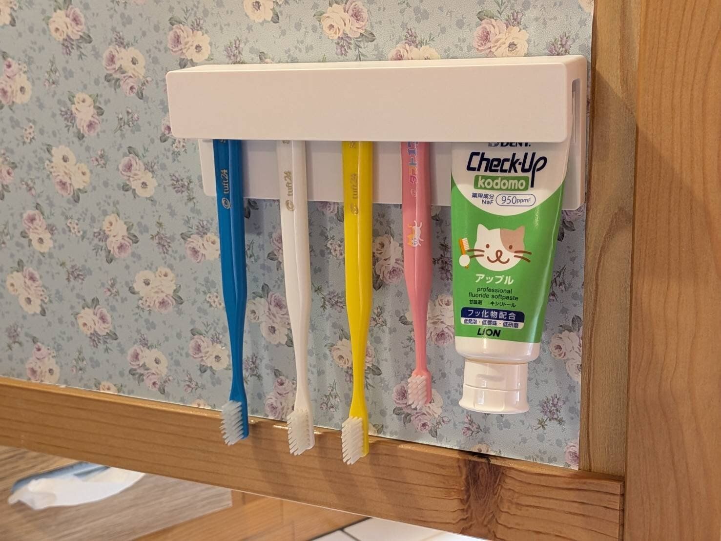 過去に使っていた歯ブラシホルダーのなかには、子ども用だとサイズが合わないものもありました。ホルダーの口の部分が大きく、子ども用歯ブラシをかけると不安定で、気づいたときにはホルダーから落ちていたことも…。
