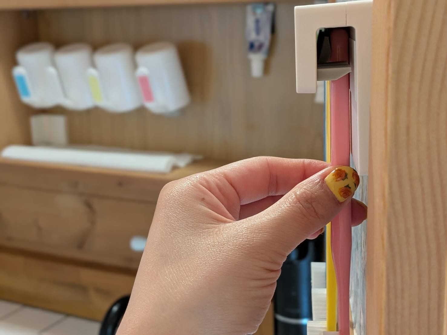 しかしこの商品は、シリコンゴムに歯ブラシを下から差し込む構造なので、ものの大きさに関係なく安心して使えます。取り出すときも下に引っ張るだけでOK!保育園児も自分で取り出し戻すことができていますよ。
