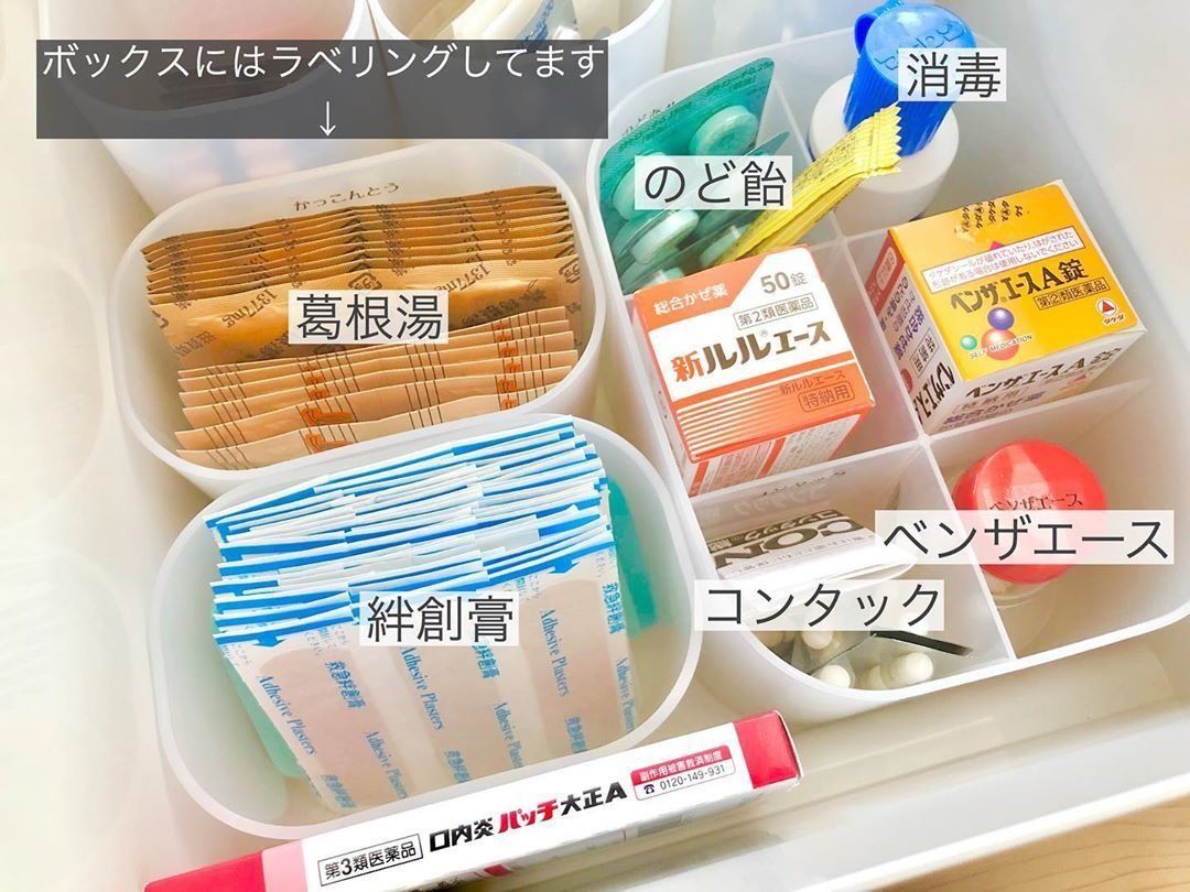 数多くの薬があるarika_919さん宅。残量などをしっかり管理できるよう、仕切りのあるダイソーのつみ重ねボックスを使って、薬の種類別に分けて収納しています。ラべリングなどもして、何がどこにあるのかひと目で分かるよう工夫しているそうです。