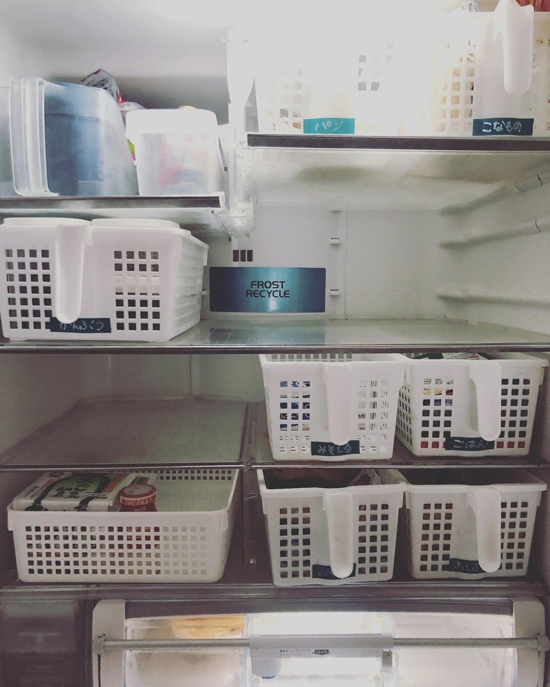 さまざまな食材や調味料を入れる冷蔵庫は、すぐゴチャゴチャになってしまう場所ですよね。nanase.39.0469さんは、100均で購入した取っ手つきのカゴを使って、ごはんのおともや粉ものなど、ジャンルと使う頻度に分けて収納しています。在庫管理しやすいだけでなく、スペースが空いて奥まで中が見やすいそう!
