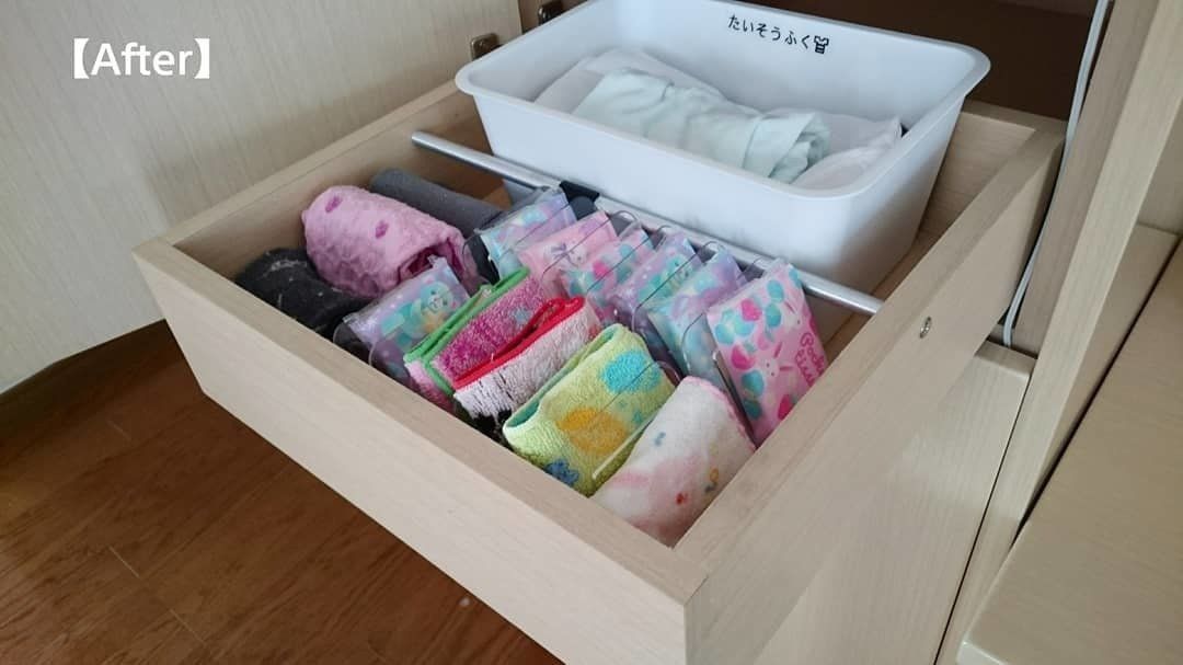 子ども用にまとめて収納していたハンカチとポケットティッシュが、1つ取り出すだけでグチャグチャになることに悩んでいたmiina_115さん。そこで、セリアのハンカチスタンドを使い、1つ1つ自立させて収納するようにしました。崩さず取り出せるようになり、引き出しの中もキレイが続くようになったそうです。