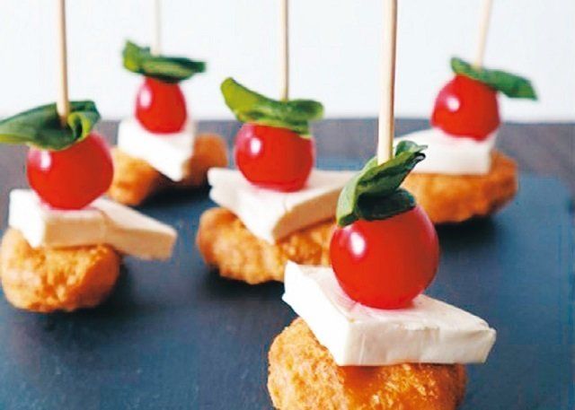 ナゲットにクリームチーズ、プチトマト、バジルを重ねてピックを刺すだけ。「人が集まるときにもササッとできておすすめ。みんな大好きナゲットだからはずしません」(臼井さん)