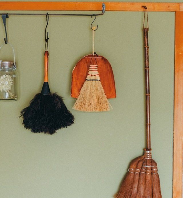 壁が薄い団地なので、時間帯によっては掃除機が使えないことも。そんなときは音が出ないほうきが大活躍。「昔ながらの道具はそのままつるしておいてもおしゃれ。気づいたときにすぐ手に取れます」