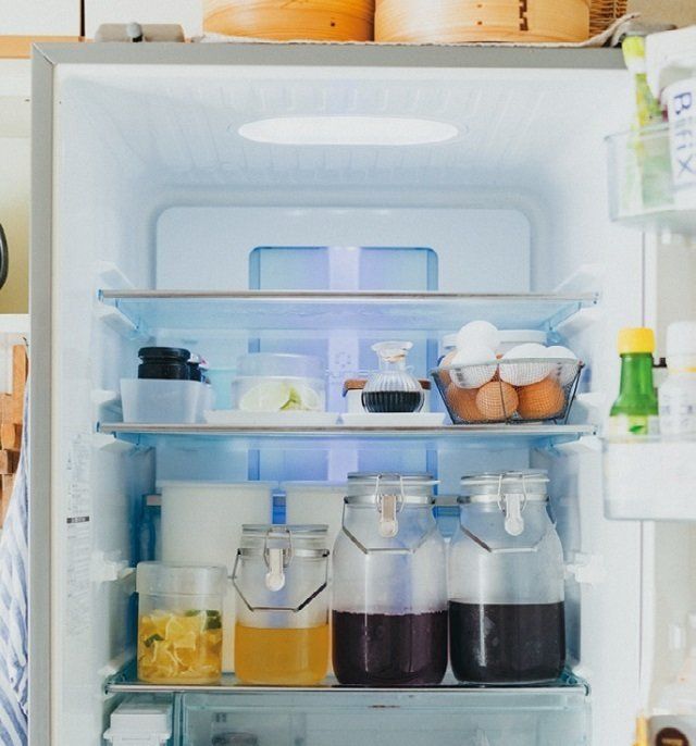 保存容器はすべてお気に入りでそろえ、見た目を美しく整えたら、冷蔵庫を開けるたびに料理のモチベーションがアップ。毎日使う物は用途別にトレーにまとめ、最上段は鍋ごと入れられるよう常に空けておきます。