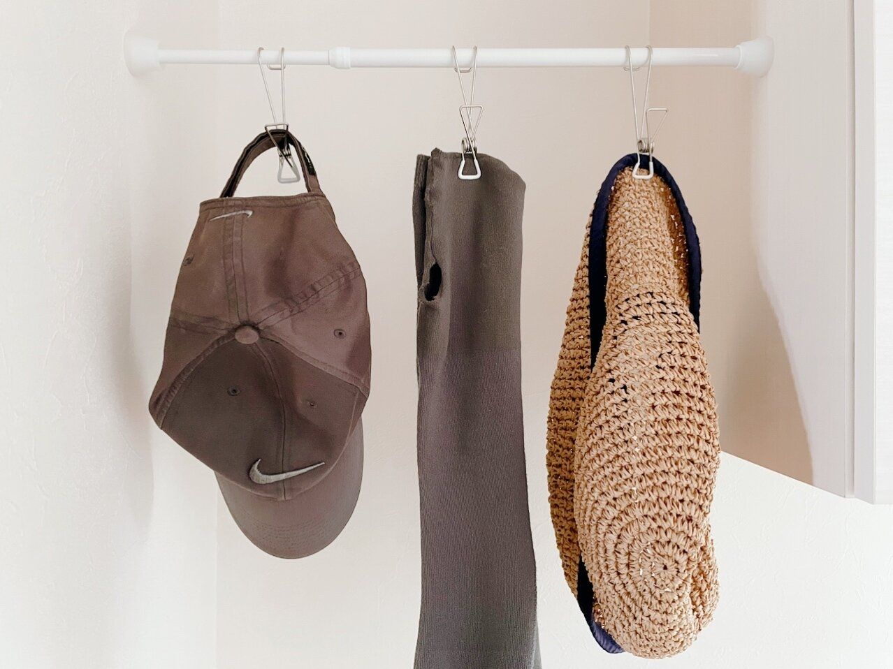 吊るすものは季節によって変わりますが、現在我が家では夫と私の帽子、日焼け防止用のアームカバーを吊るしています。クリップで挟む以外にもクリップ部分に引っ掛けることもできるので、私のマスクの一時置き場としても活用しています。