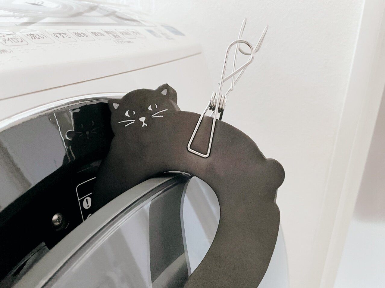 洗濯機のドアを閉めきらず、湿気を溜めないように予防掃除の1つとして使っているキャンドゥのドアストッパー。組みわせて使っているのが無印良品の「ステンレスひっかけるワイヤークリップ」(4個入り 390円)です。