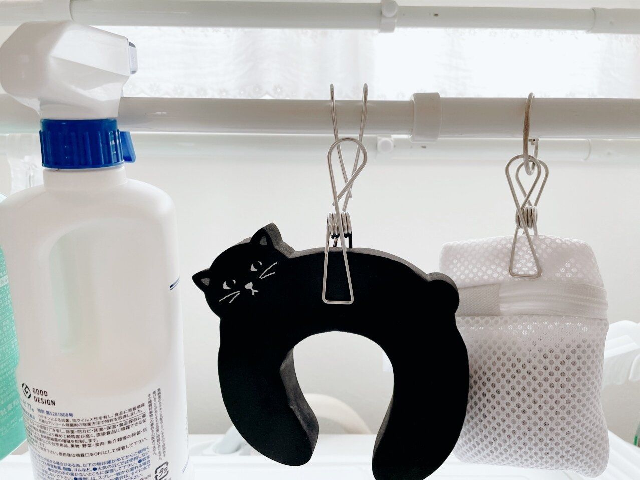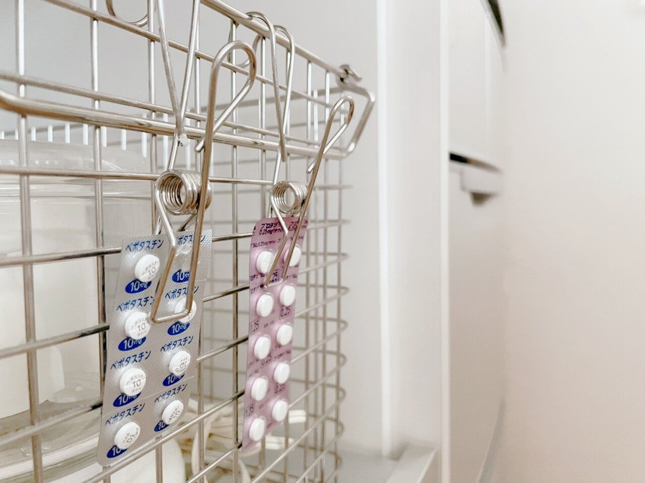 デイリーまたは比較的頻繁に飲む薬を吊るし収納するのにも使っています。調子の悪い時だけ使う薬は棚の中にボックス収納していますが、高頻度で飲む薬は棚上から取り出すのが面倒となって飲み忘れたり、存在を忘れたりしないように、目に見える場所に吊るしておくと便利です。