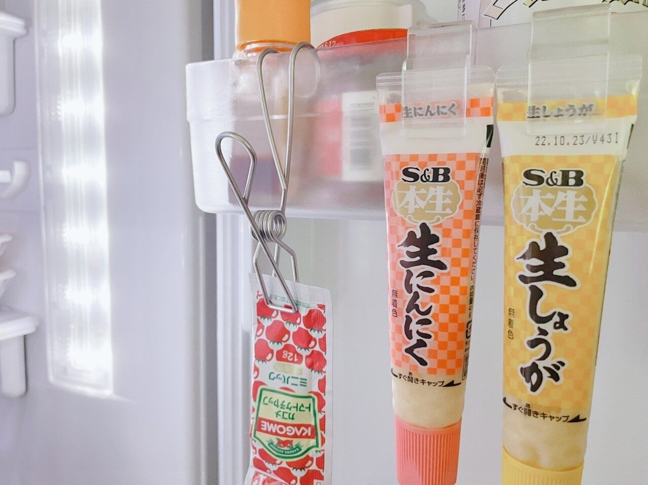 小袋のしょうがやニンニク、ケチャップなど使ってしまうのを忘れたくないものがあった場合にも活用。目に留まりやすいところに吊るしておくことで使い忘れを防止しています。