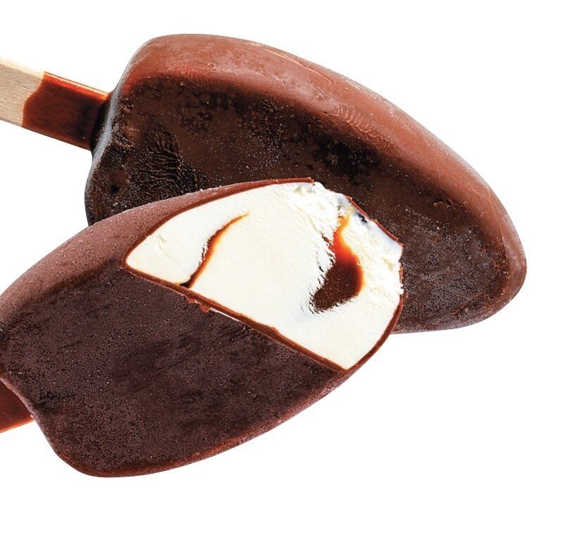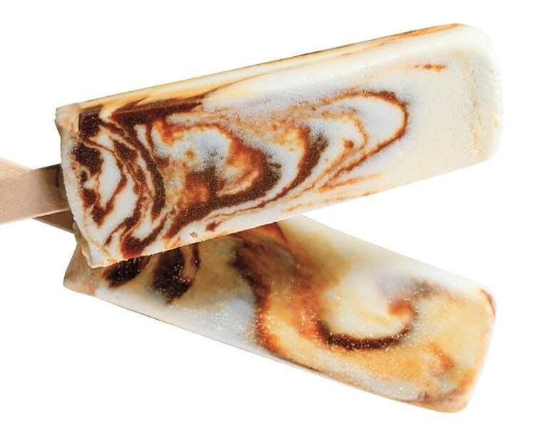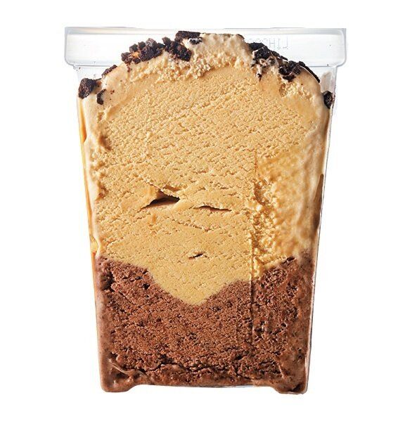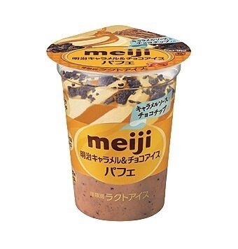(M)「上層は、本格ビターカラメルではなく、懐かしの香りと甘みのキャラメルアイス。下はパリパリチョコ入りチョコアイス。スイーツ好きを満足させるしっかりとした甘さ」。