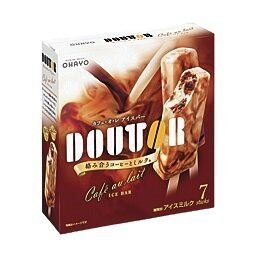 (M)「あのドトールと共同開発。深いり豆をエスプレッソ抽出したコーヒーエキスを使用したミルクアイス。まるで本当のカフェ・オ・レを飲んでいるような気分に。7本入り」。