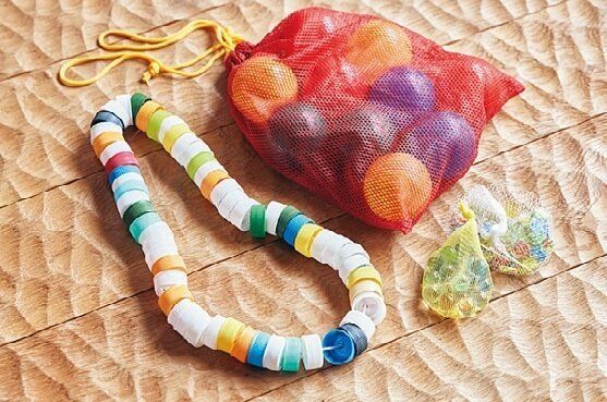 手指の感覚が敏感で、常に指先で物を触っていたい利用者のために支援員が作った道具たち。好みに合うものを探して、ビー玉やペットボトルの蓋など様々な素材が使われています。