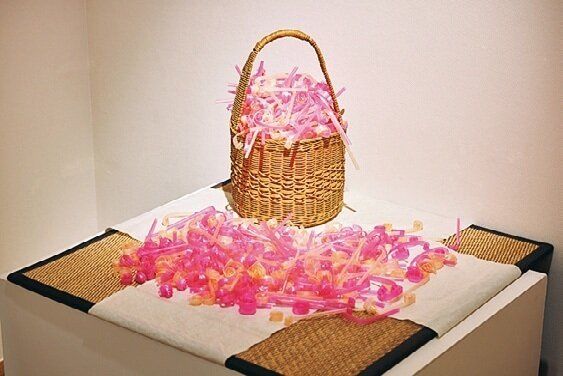 福島県主催の公募展で県知事賞にも選ばれた『ぼくの365日』。10歳の男の子が毎日噛み続けて、丸まっていくストローを、母親が集めて作品に。バスケットは祖母の手作り。