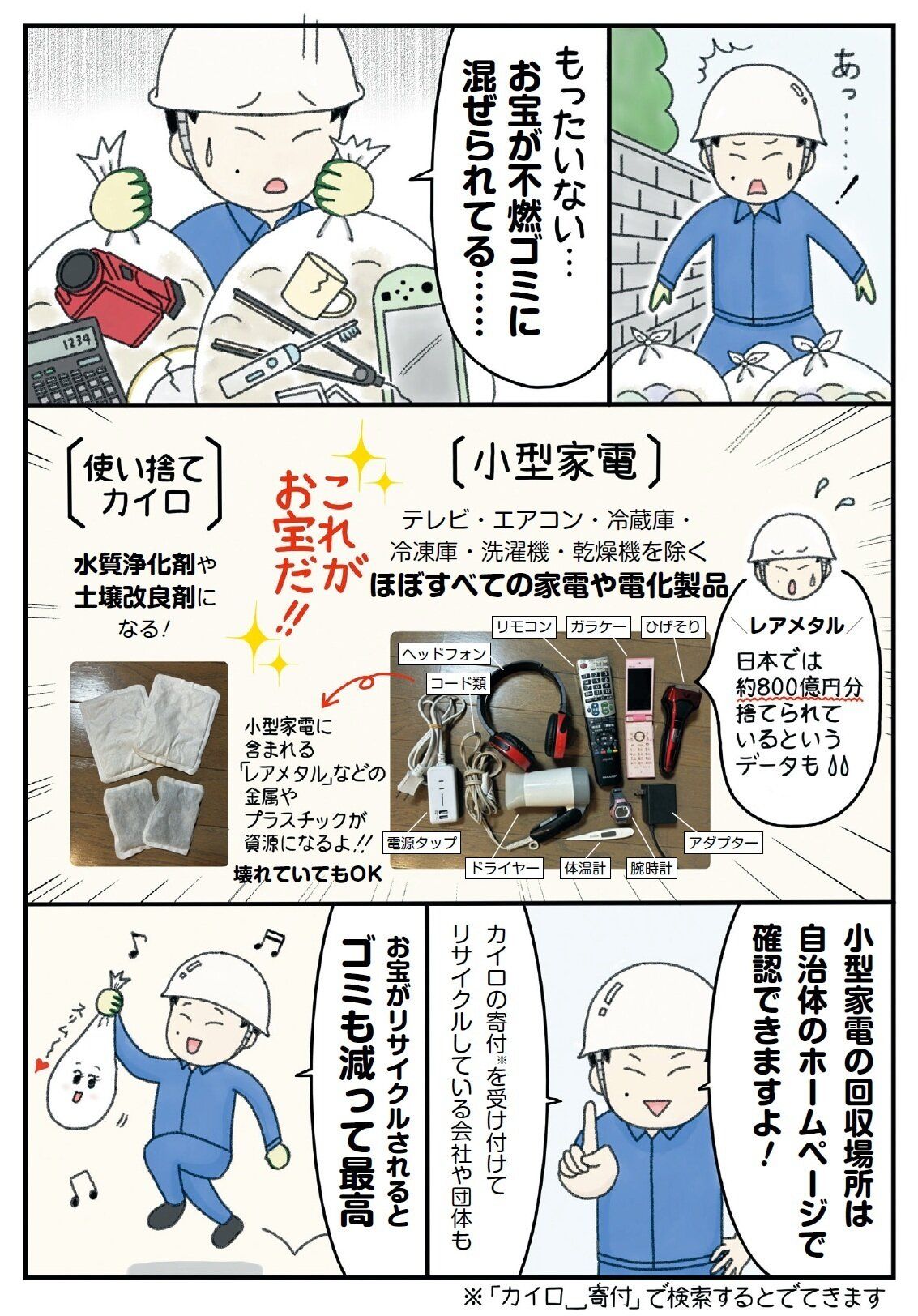 コード類やドライヤーなどの小型家電は不燃ゴミではなくお宝!ゴミを集める人にやさしいゴミは、地球にもやさしい。芸人とゴミ清掃2足のワラジを履いて12年のマシンガンズ滝沢さんが日々のゴミ収集で出合った「やさしいゴミ」を妻がまんが化!