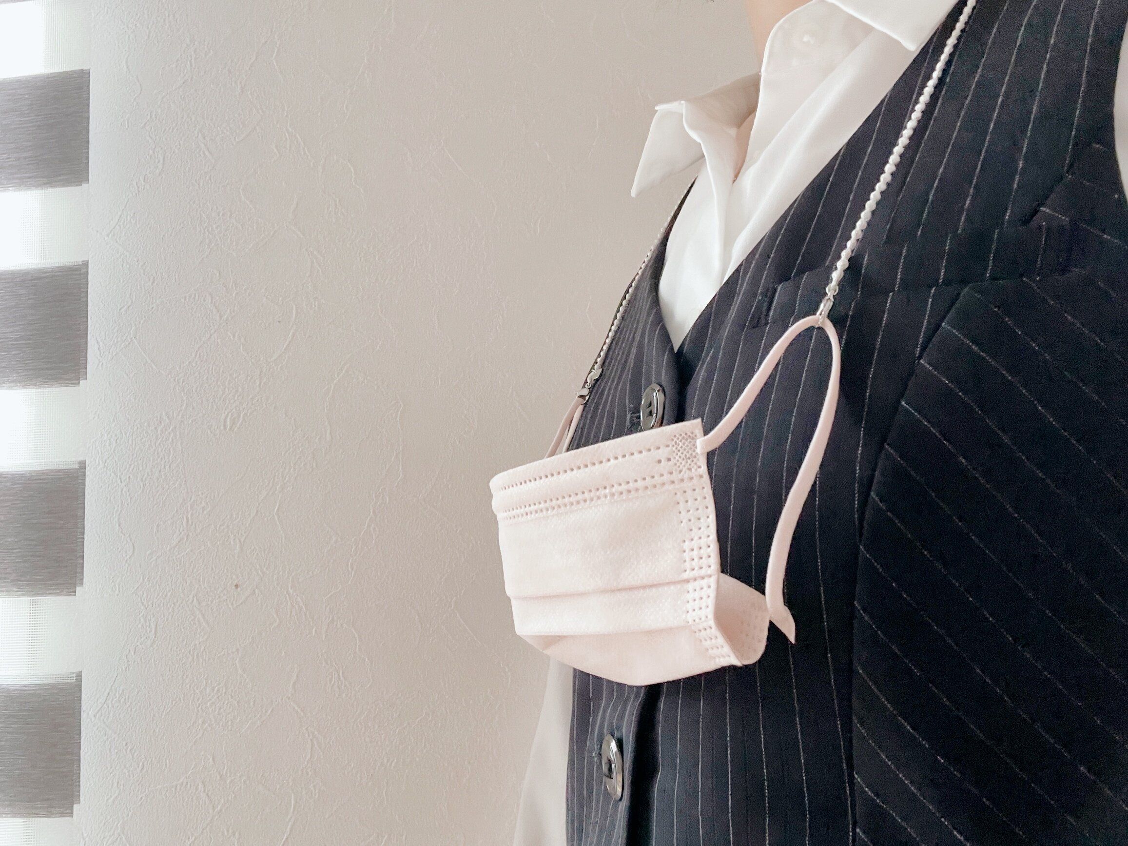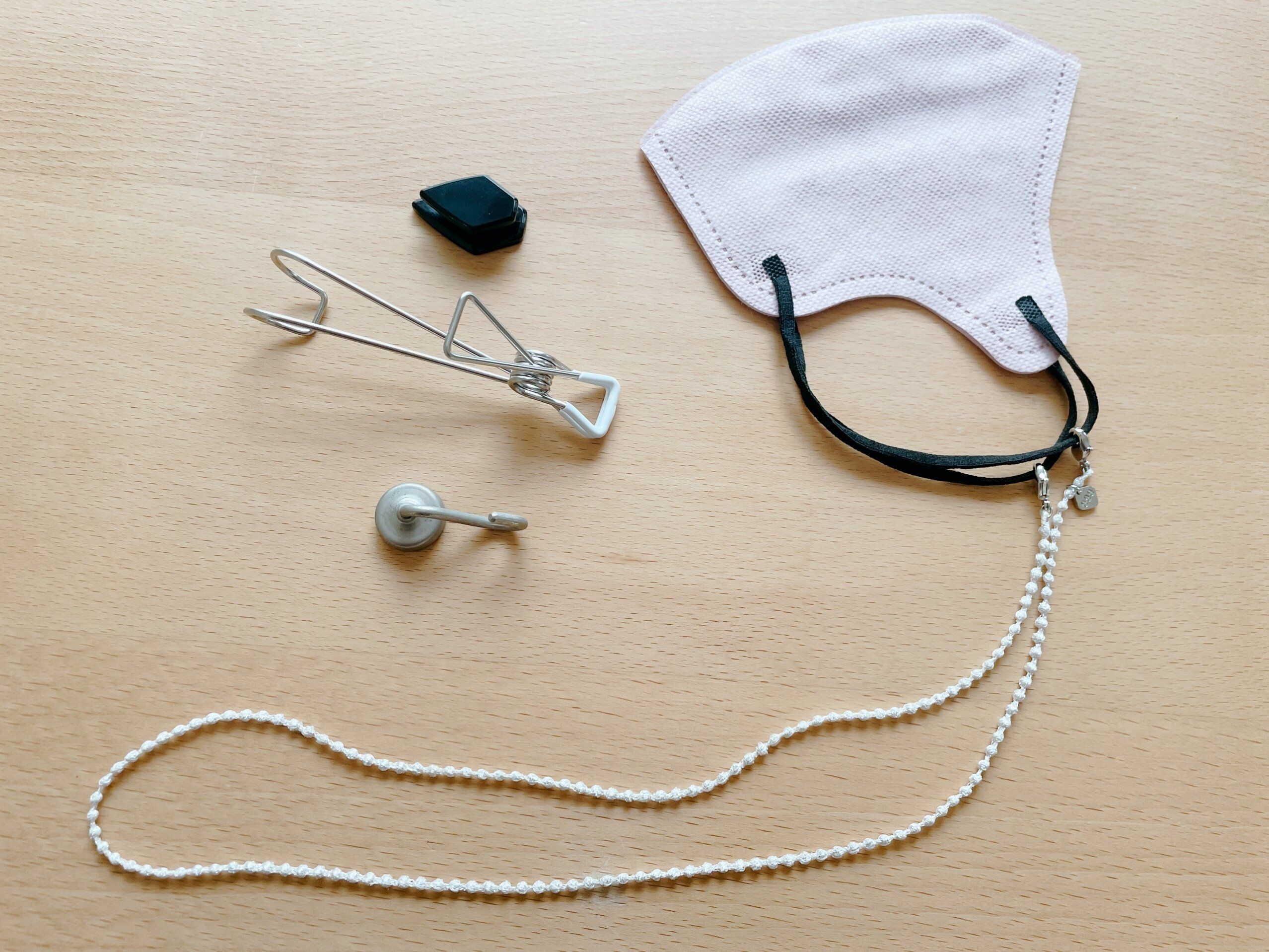 会社でちょっとマスクを外したいという時に便利なのがマスクコード(楽天購入品、3,520円)。マスクに装着しておけば首からかけておけるので、机の上に置いたりポケットに押し込んだりということがなくなります。