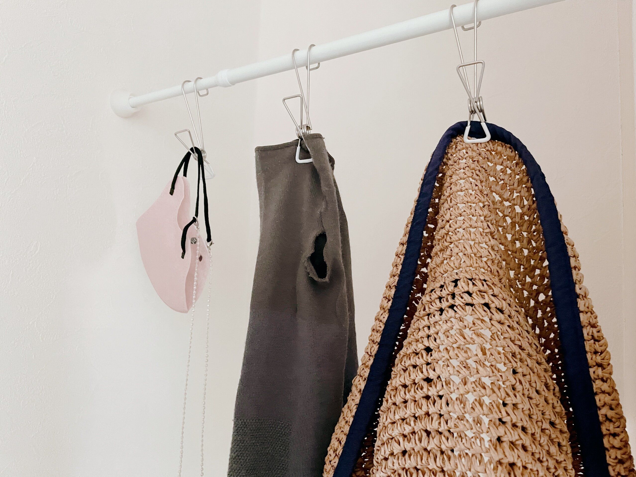 玄関につっぱり棒やラダーハンガーなど引っかける場所があれば使えるのがセリアのステンレスワイヤークリップ(3個入り・110円)。特に挟む必要はなく、こちらも引っかけておくだけ。取るのも簡単なので面倒を感じずにすみます。