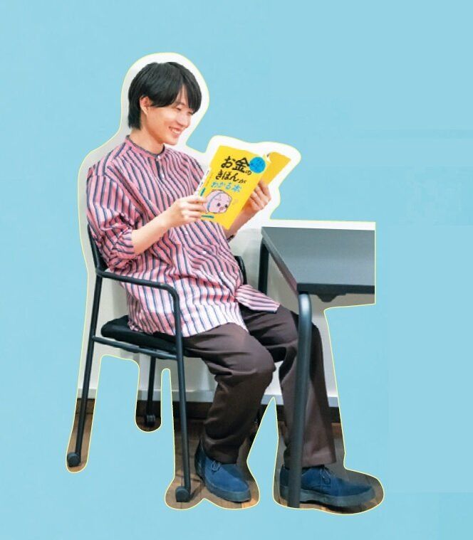 『サンキュ!』3月号の別冊付録「お金のきほんがわかる本」を手に取って眺める神木さん。このあと「これ読みたいので、持って帰らせてください!」と爽やかに帰っていきました。
