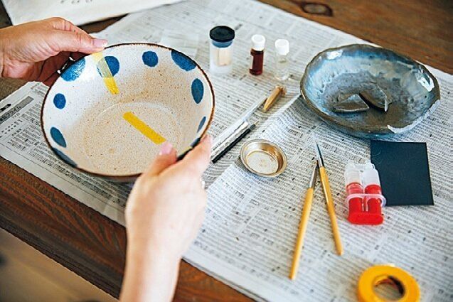「元々、お菓子作りや編み物などの手作業が好き。自分で作るとより愛着が湧いてきます」。最近は、市販の金継ぎキットを使って割れた器の手直しも。