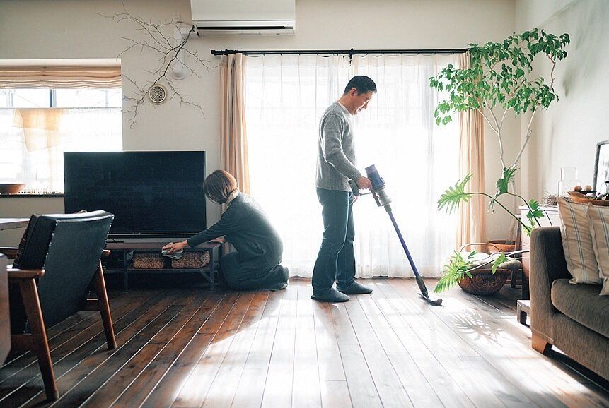 夫に頼むと自分が普段やらない場所にも掃除機をかけてくれることに気付いたJさん。「2人でやるほうが早くてきれいになるから」と一緒に掃除することを週に1度の習慣に。