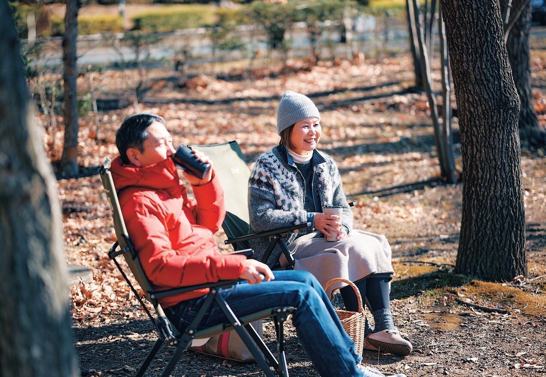キャンプ用のいす(チェア)を持って出かけ、アウトドアでくつろぎの時間を過ごすこと。