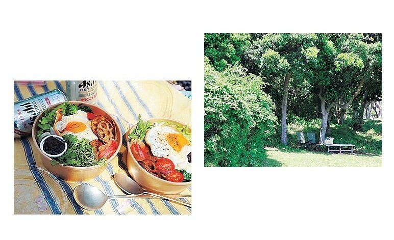 キャンプほど大がかりにならずに、自然の中でのんびり過ごせるのが魅力。おべんとう作りが面倒なときは、サンドイッチを買って行くことも。「遠出したついでに道の駅に寄るのも楽しみ」。