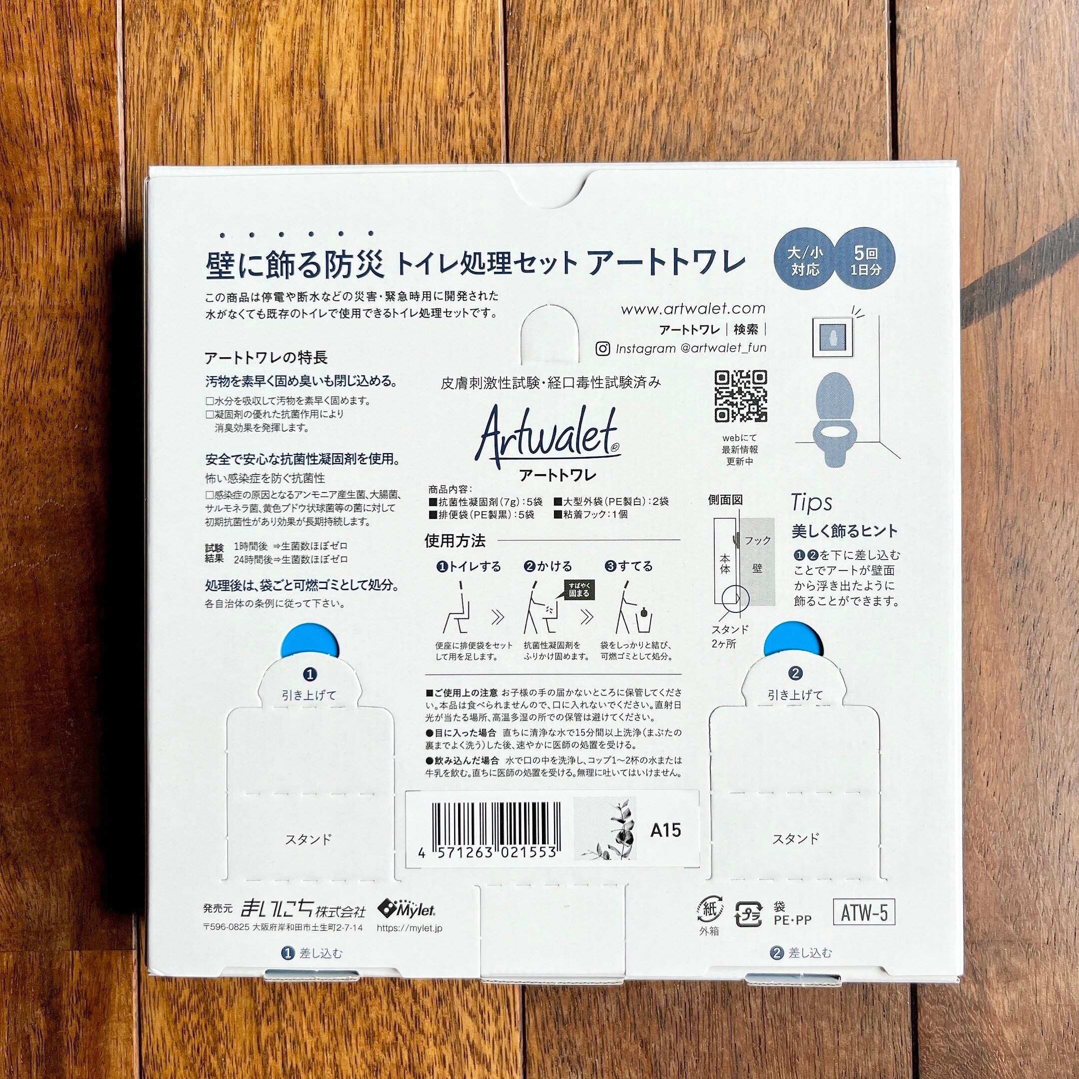 壁に掛けられるオシャレなアート。実はこのアート、災害用のトイレなんです。厚さ約2cmの箱の中には5回分のトイレ処理セットが入っています。アートの種類も豊富で、画像のアート以外にも10種類以上のラインアップがあります。ご自身が好きなアートを選ぶ時間もワクワクする時間です。