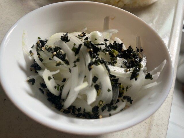 続いては新玉ねぎのサラダにふりかけてみました。新玉ねぎをただスライスしただけ。