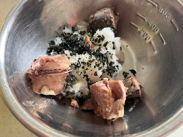 すると、大根おろしの汁を吸ったわかめが少しだけ戻りサバの水煮缶とちょうど良く合わさります。