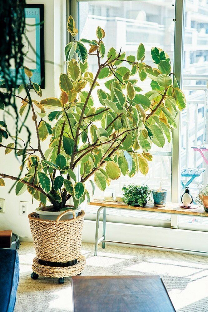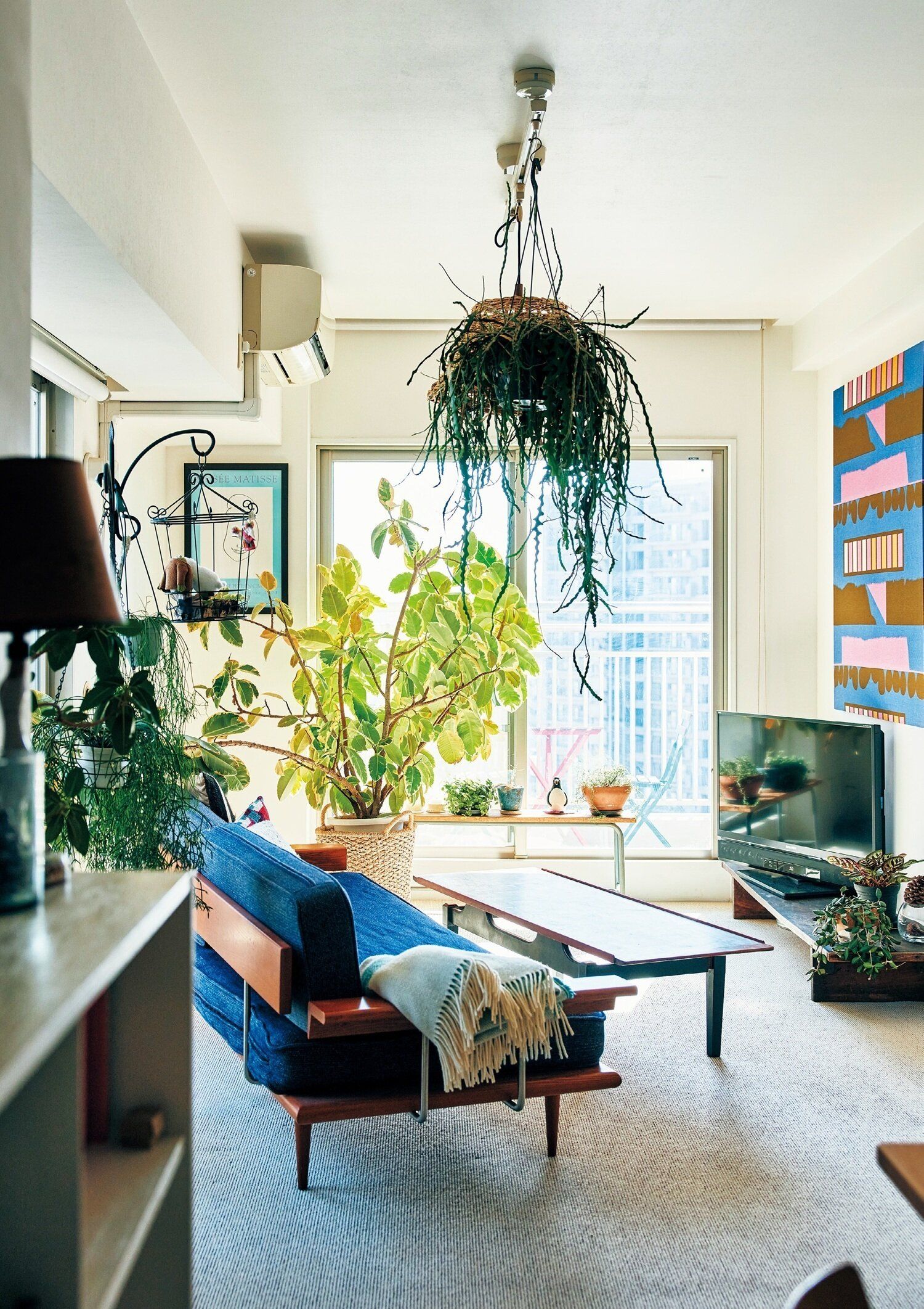 大きく育ったグリーンは、なんと10年前に買ったもの!それ以外は、天井から吊したり、飾り台に載せたりしています。「ルンバも15年前から使っているから、床に置かないのがすっかり習慣になりました」。