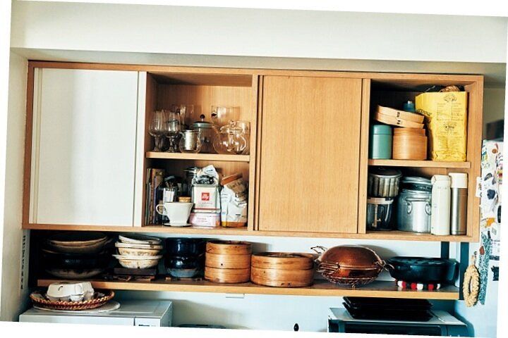 食器、お茶道具、弁当箱などを並べる戸棚は、フルオープンにせず、引き戸の扉を半分(1枚)だけ設置しました。生活感のあるものは扉で目隠しできるから、ざっくりしまえて気がラクです。