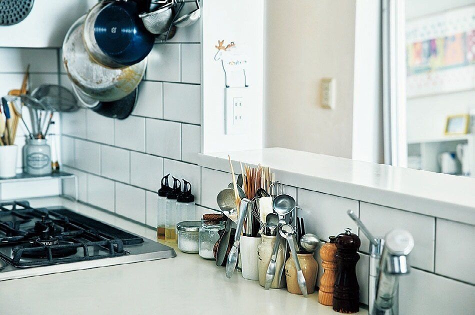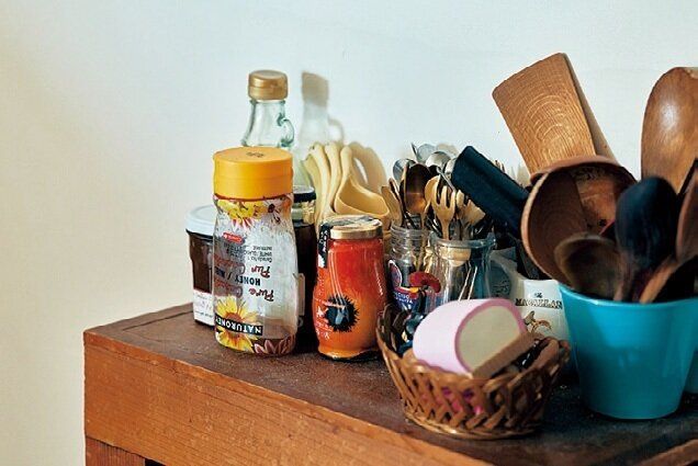 毎日使うツールは、作業台から「一歩も動かず取れる位置」に並べています。作業台の背面には、「振り返れば取れる位置」にカトラリーをセット。かわいい空き瓶などを再利用し、アイテム別に立てておくと一目瞭然に。
