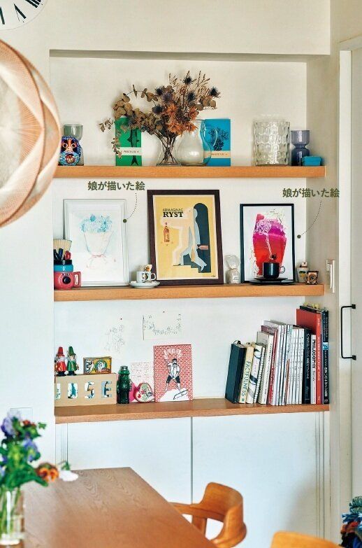 子どもの絵、旅先で買った雑貨などの思い出の品を飾りながら愛でる