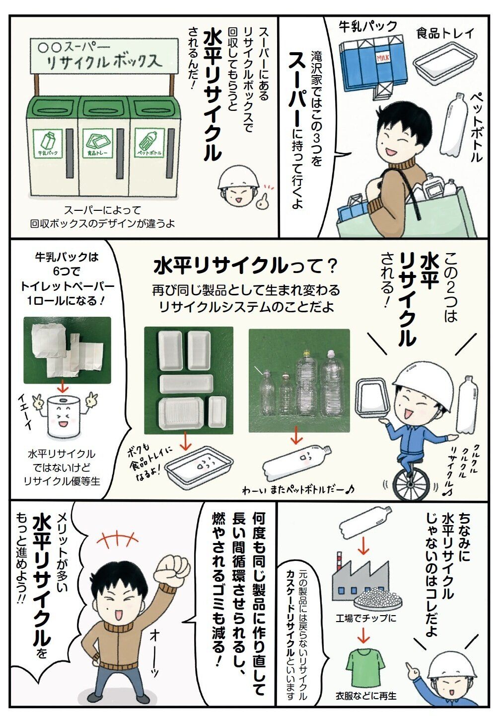 日々のリサイクル。地域のゴミ集積場の「資源」に出してるよって人が多いと思いますが、僕が推しているのは「水平リサイクル」。ペットボトルや食品トレイ、アルミ缶やビンなどを同じ形に再生するので資源を半永久的に使い回すことができ、CO2排出やゴミが減らせるんです。水平リサイクルの入り口として代表的なのがスーパーのリサイクルボックス。トレイは洗ってとか、ペットボトルのキャップやラベルをはずして、などの決まり事を「面倒くさ」って感じる人がいるかもしれないけど、これは資源に不純物を混ぜないことでグレードの高い資源として回収するためなんですよ。せっかくリサイクルするならよりよいカタチで。頭の片隅に入れてもらえたらうれしいです~!