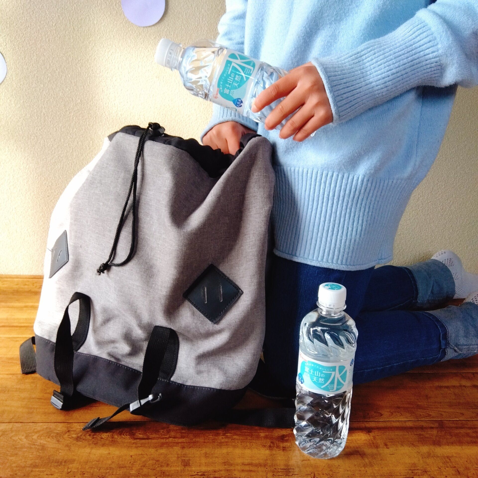 災害時に、地域の避難所に逃げる場合にも備えて、非常持ち出し袋にも水を入れています。ただし、重すぎて避難の妨げにならないよう500mlのペットボトルを2本だけ。
