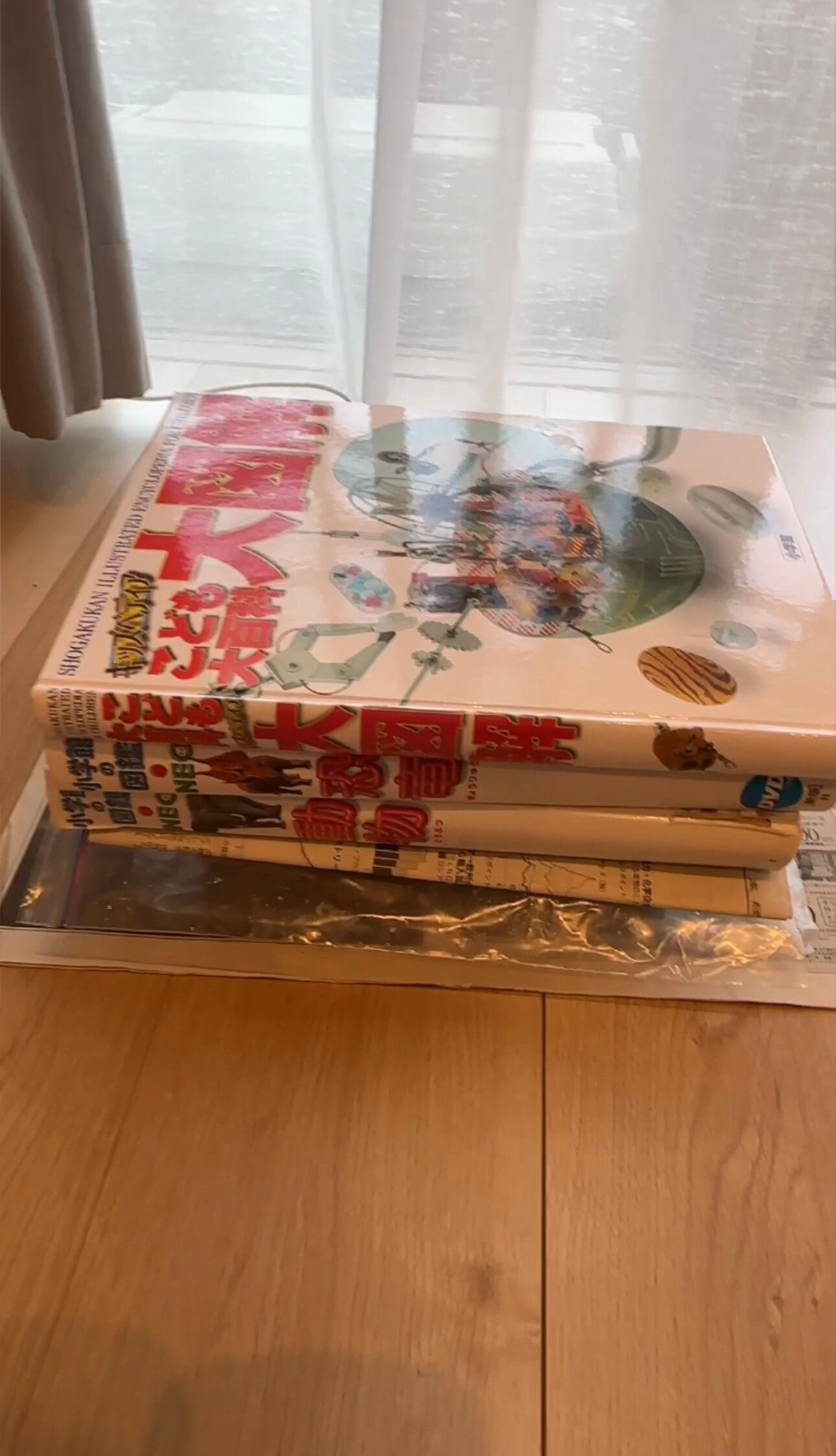 床に新聞紙などを敷いて、濡れないようにしてから本を置き、さらにその上から重りを置いていきます。