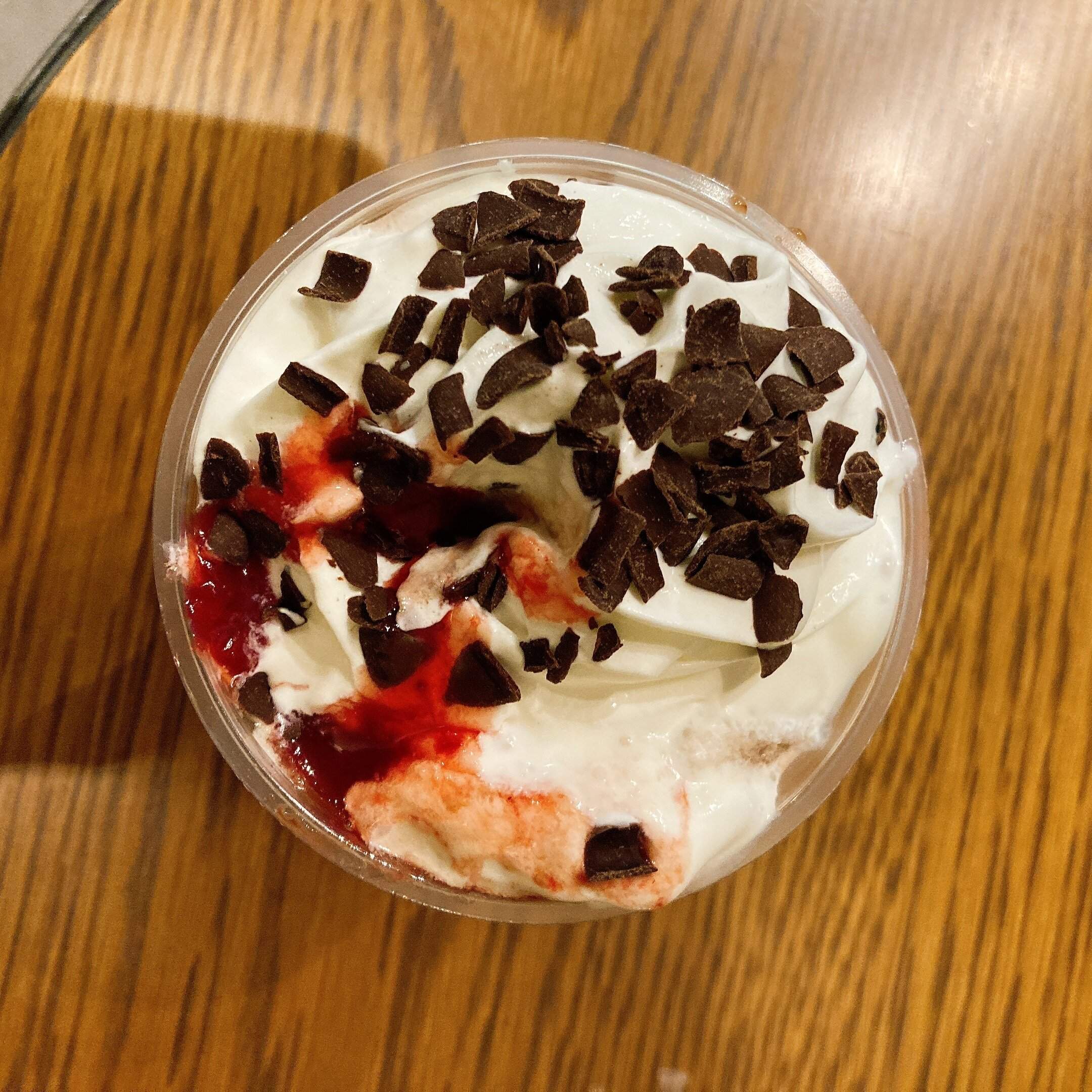 一番上にはホイップクリーム、チョコレート、ストロベリー果肉が乗っています。