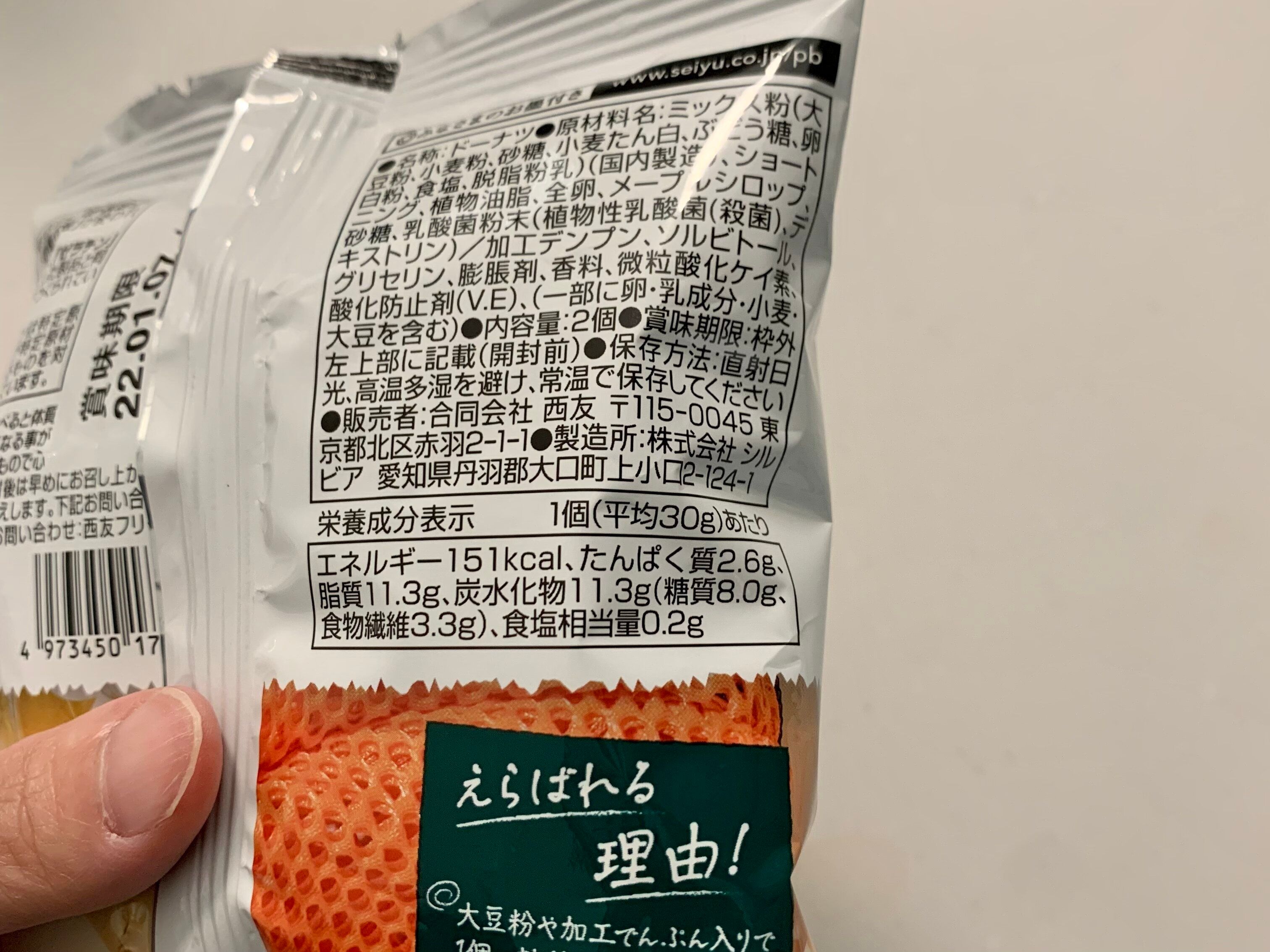 大豆粉入りメープルドーナツです。2個入りで162円(税込)とお財布にも優しい商品です。