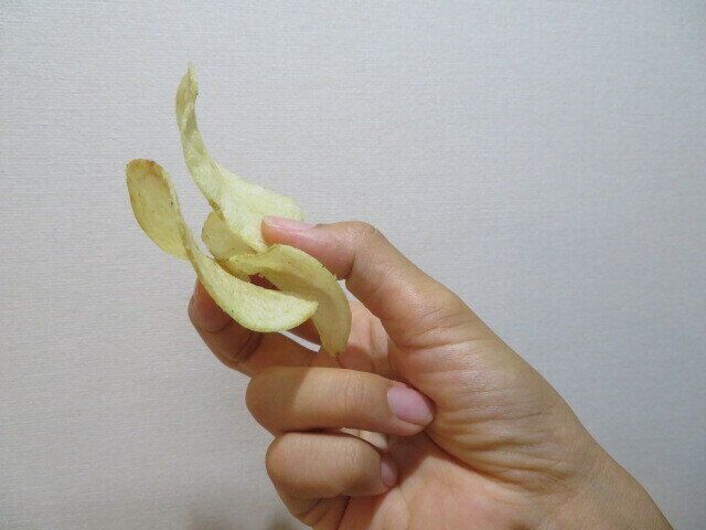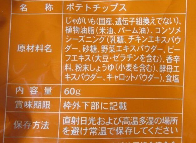 このポテトチップスの原材料名には、「植物油脂(米油、パーム油)」の記載があり、パーム油を使っていることがすぐわかります。