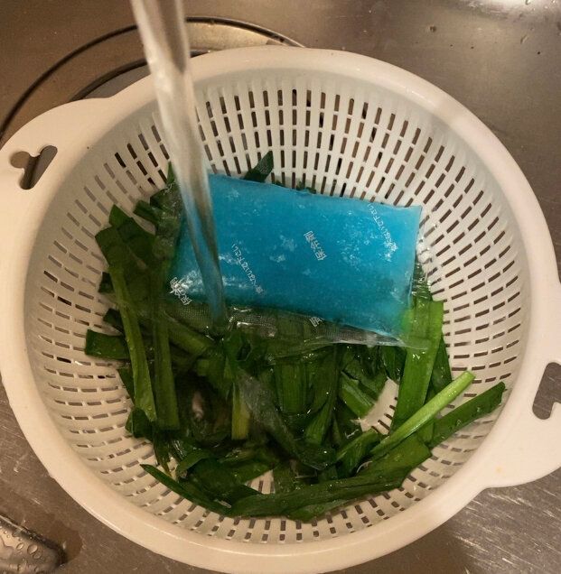 我が家は氷を常備していないため、冷たい麺を作る時や、葉物の野菜をパリッとさせたい時、茹でた野菜の色止めをしたい時など冷たいお水が欲しい時、綺麗に洗った保冷剤を使っています。