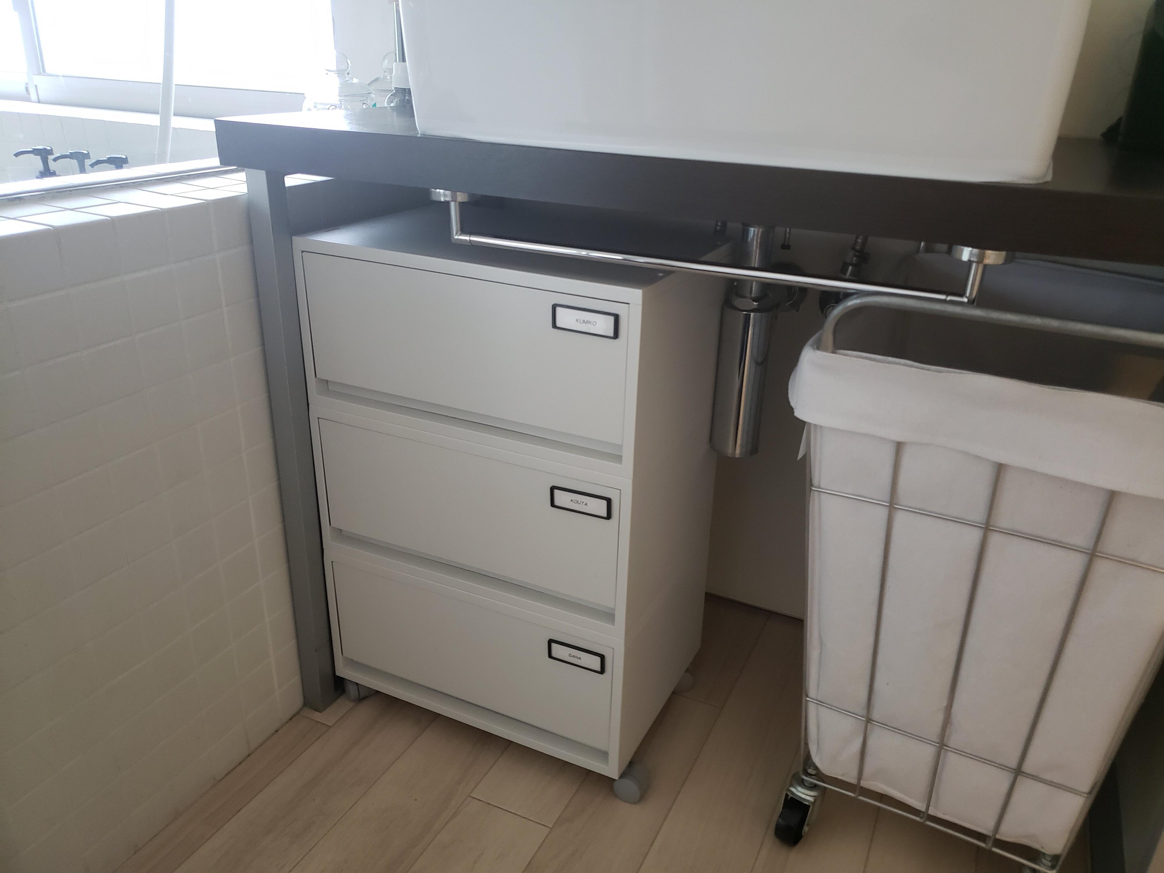 洗面台の下のスペースを使おうと決めて、サイズを測って高さが収まるケースに巡り合った時は嬉しかったことを覚えています。