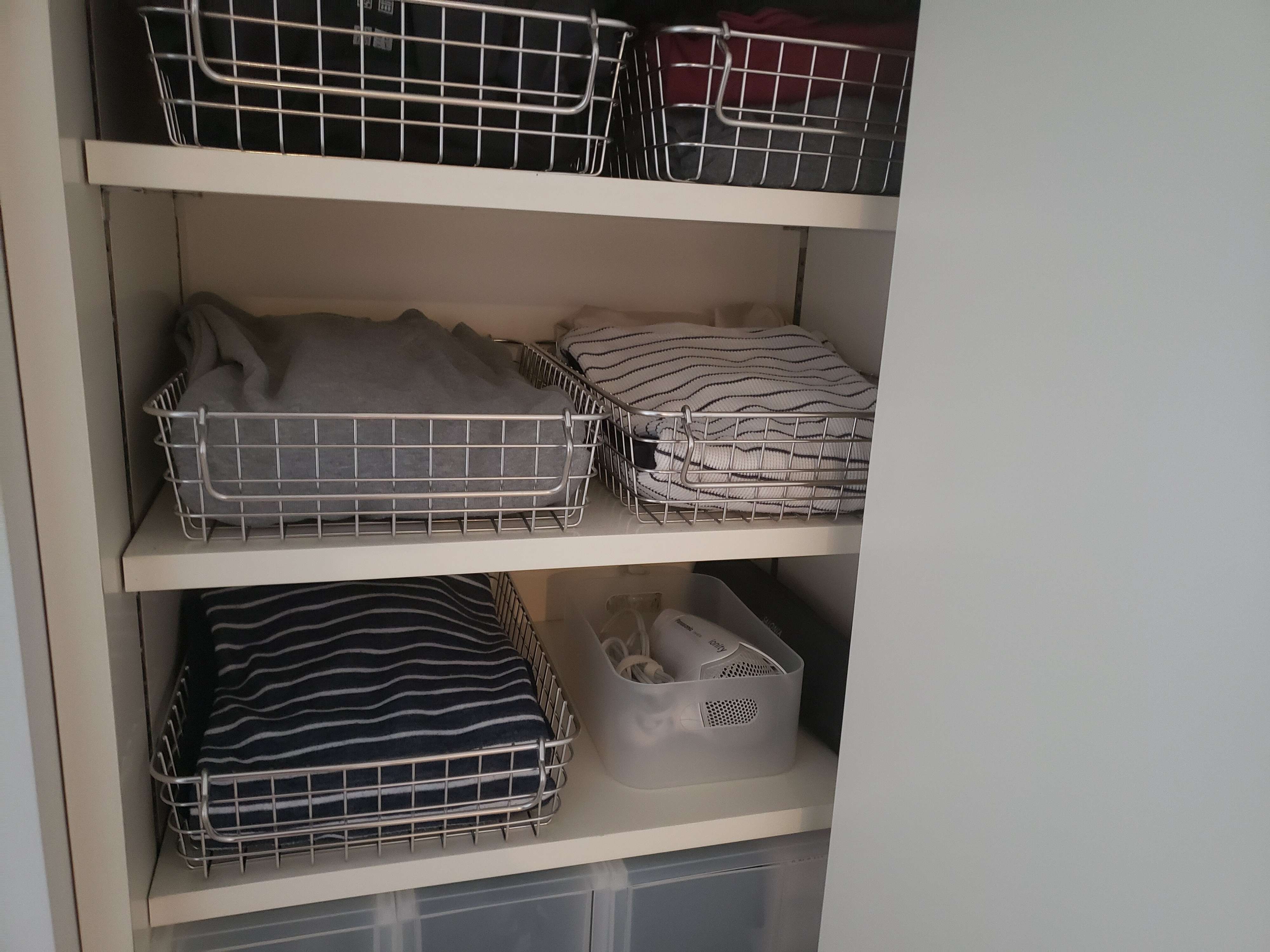下着はお風呂から出て一歩で届くところに置いたら、パジャマはもう一歩歩いた所にワイヤーステンレスバスケットに収納しています。