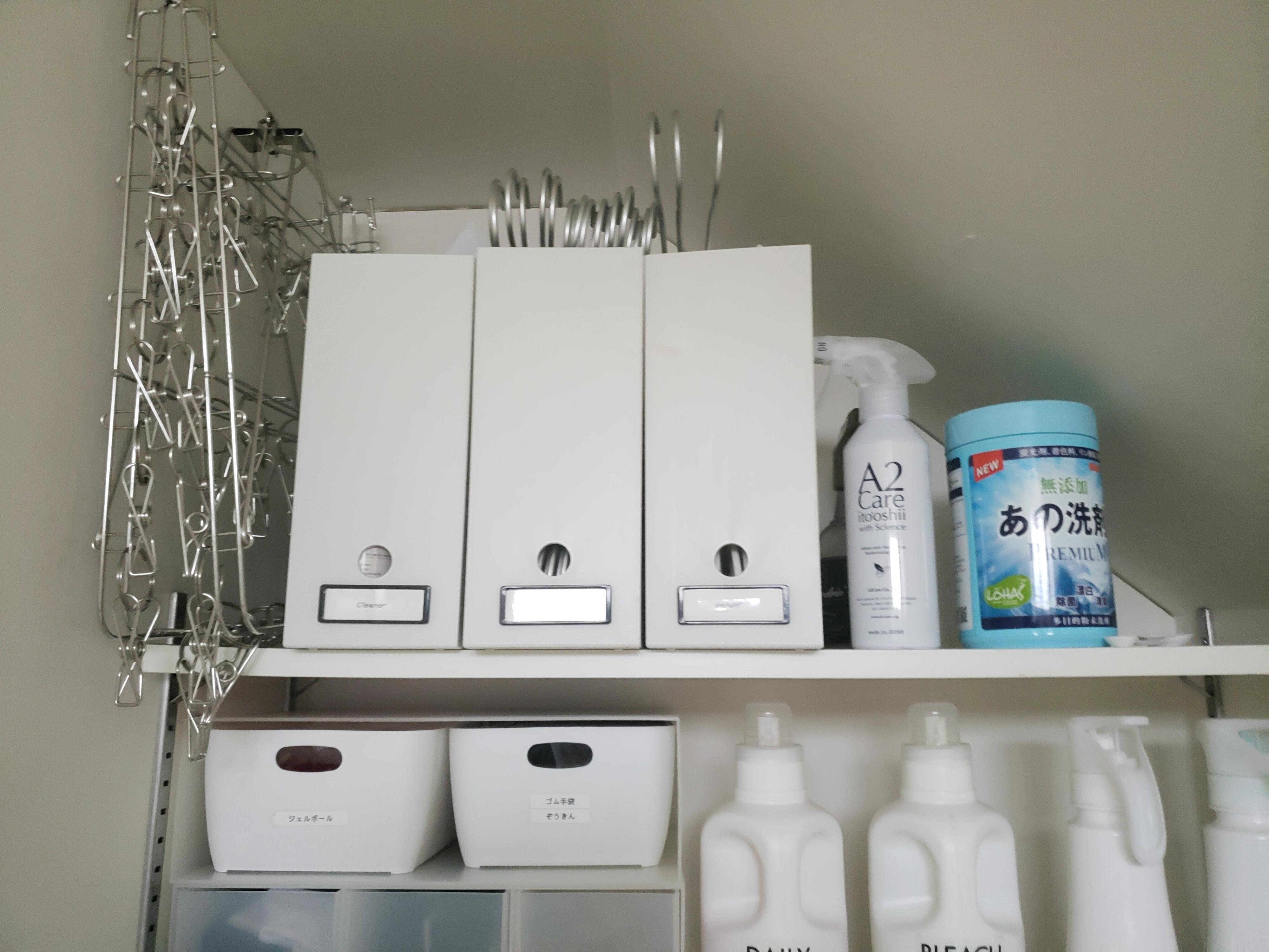 なので、ハンガーや洗濯バサミを収納しなくては…ということで、ファイルボックスを使ってハンガーを収納し、ポリプロピレン小物収納を使って、洗濯バサミを始め細々したものを収納し、スッキリすることができました!