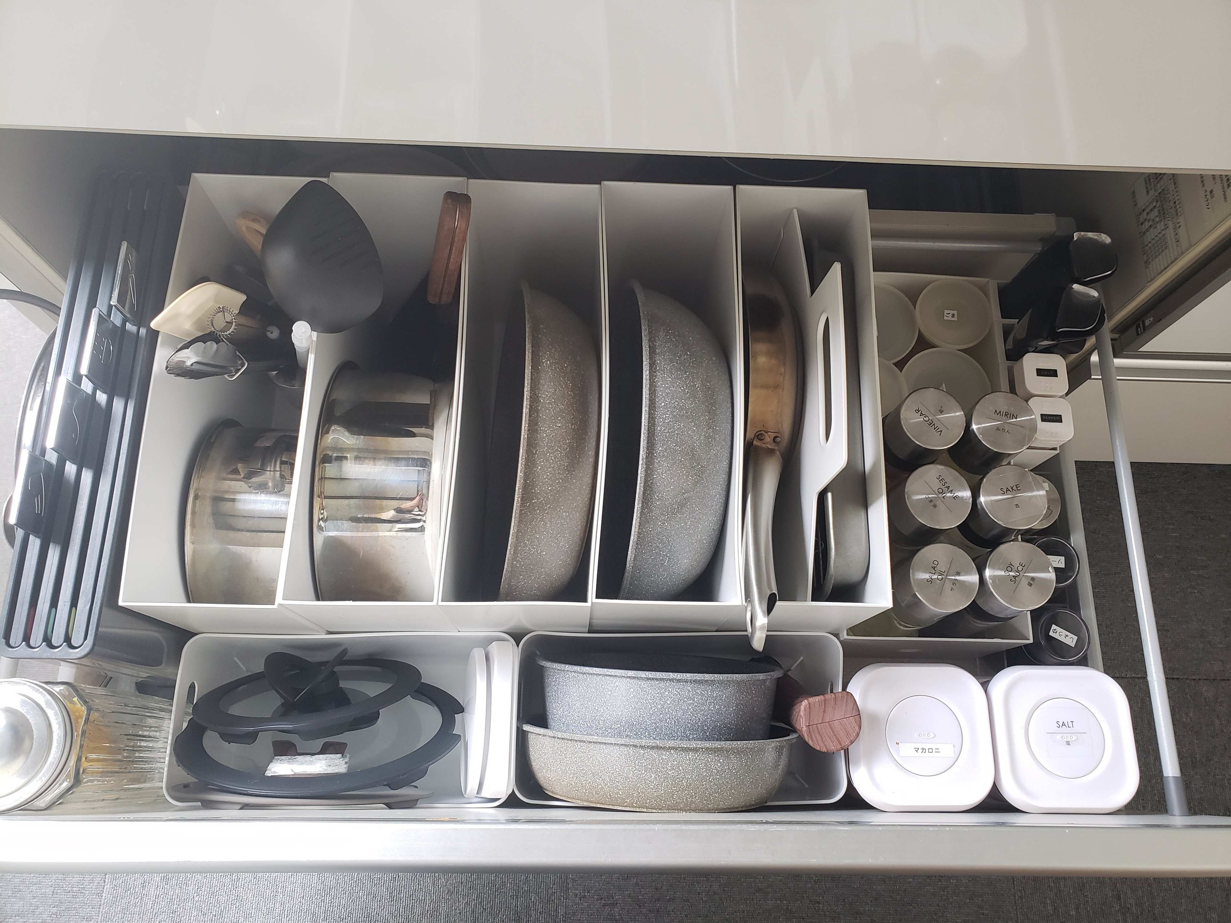 サッと取り出せるように、なるべく一つのケースに一つの鍋、一つのフライパンを収納するようにしています。