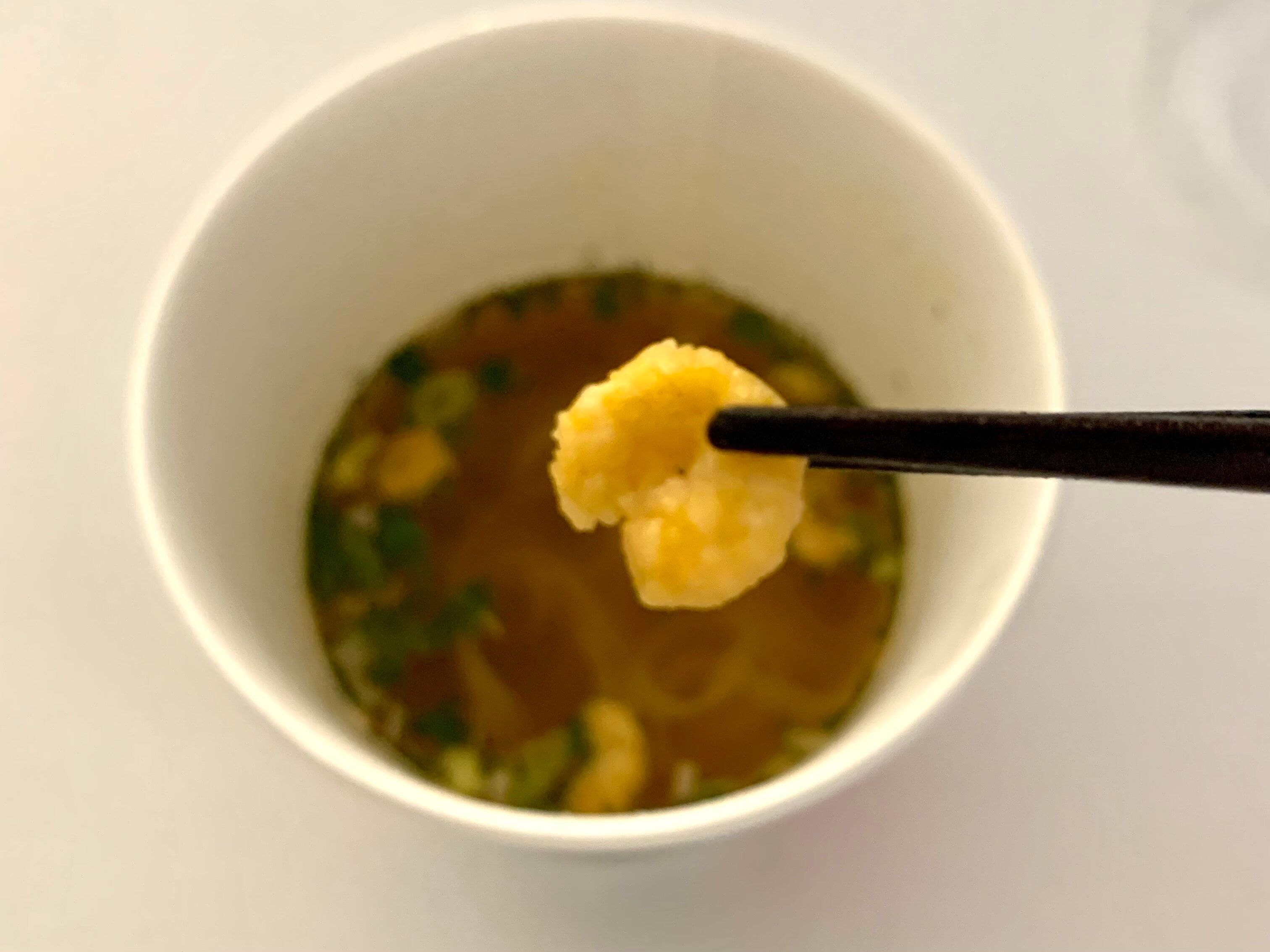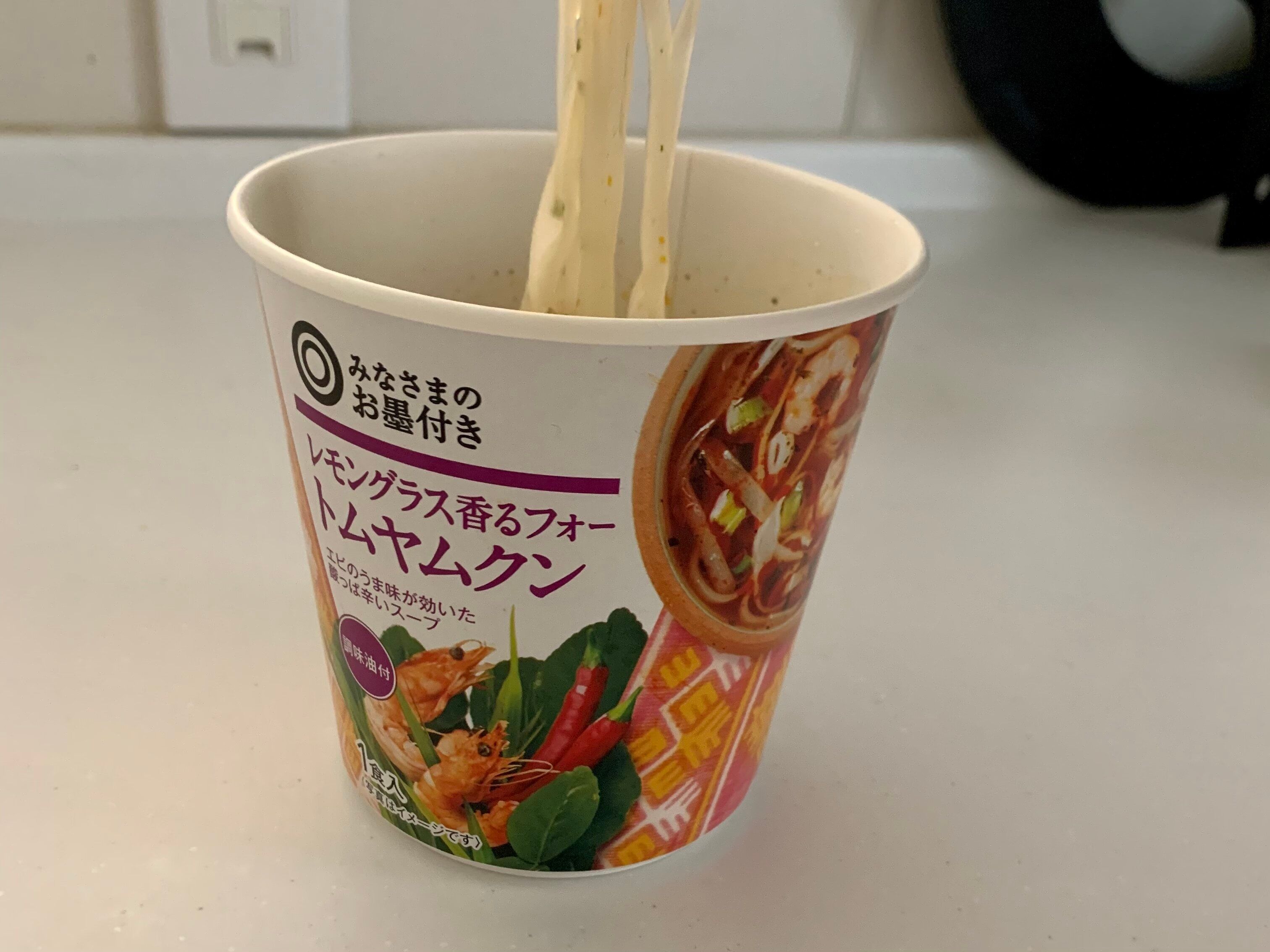 中身は粉末スープと乾燥フォー。こちらをカップに入れてお湯を注ぎ、3分間待ちます。