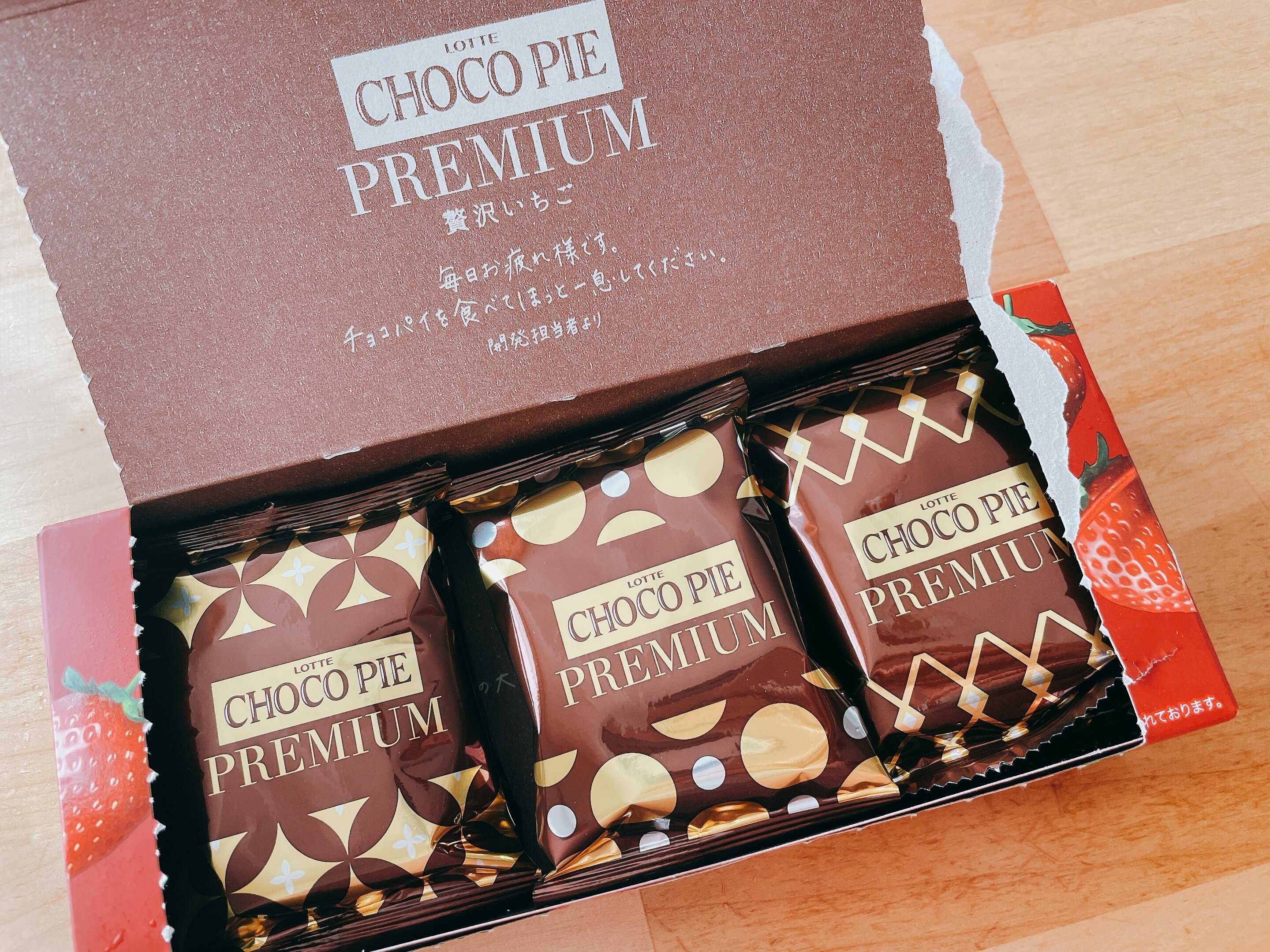 プレーンのチョコパイは9個入りで300円前後なのですがチョコパイプレミアムの贅沢いちごは6個入りで400円ほどなので値段もプレミアムです。