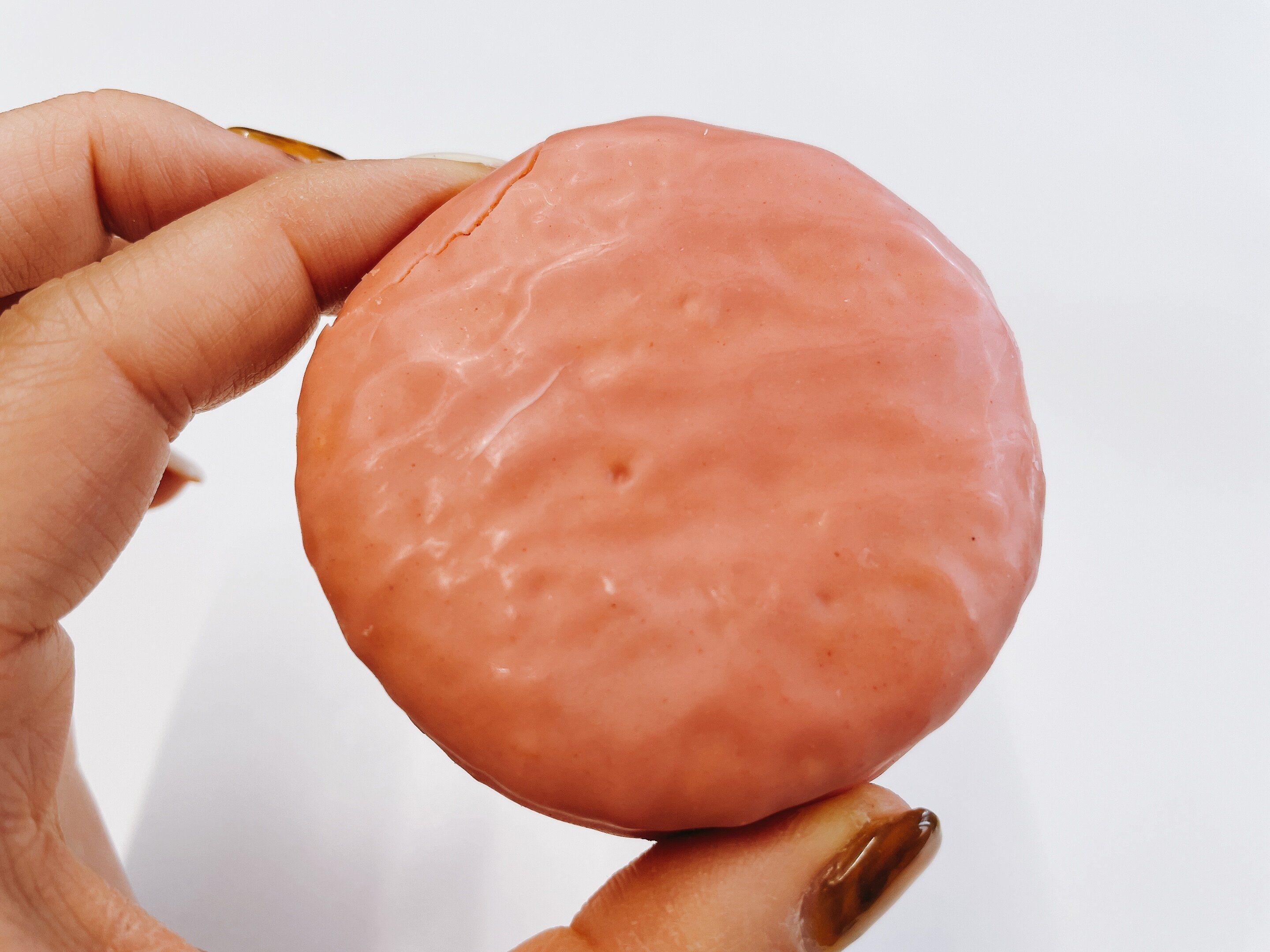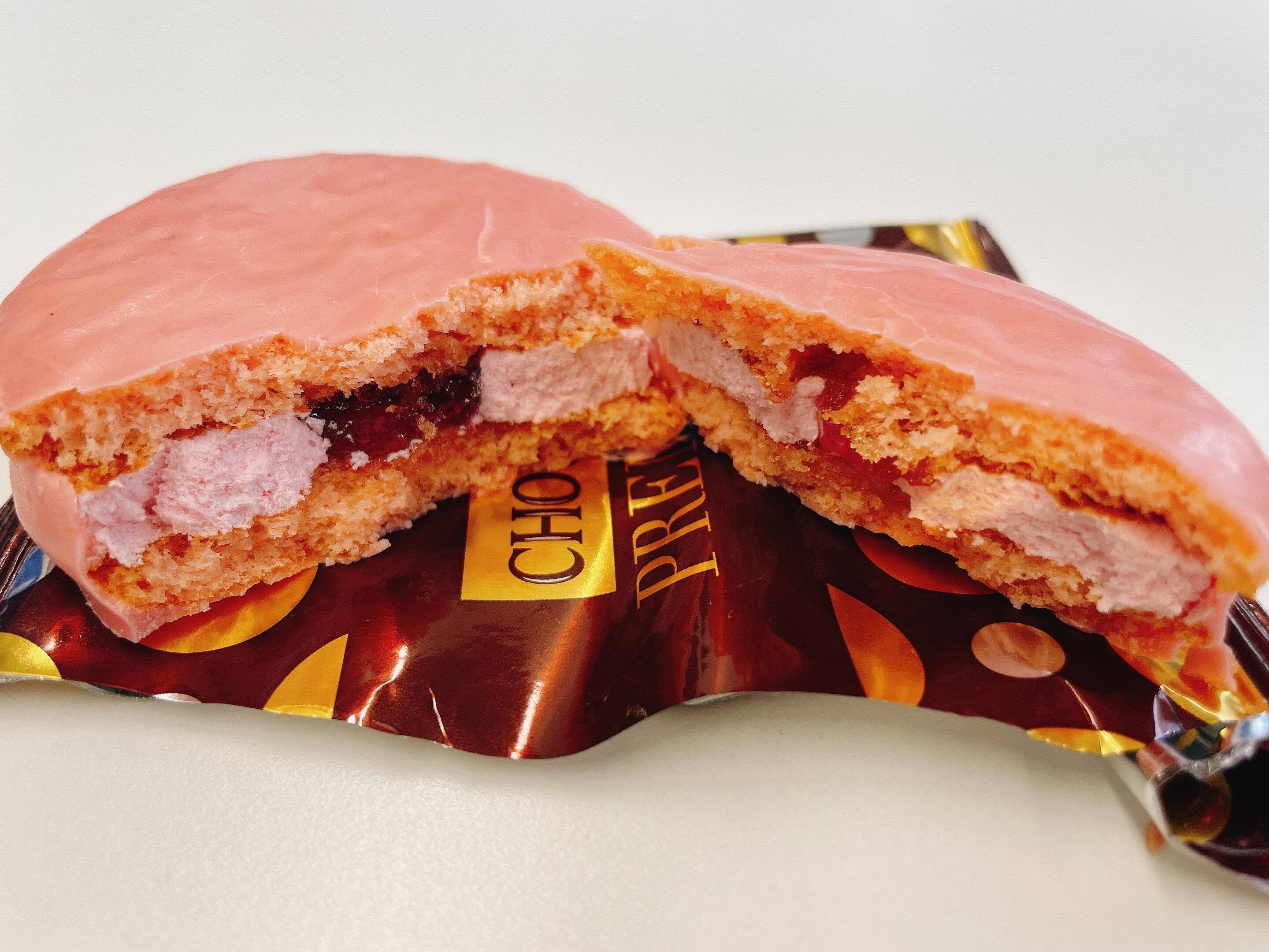 いちごチョコに包まれているのでピンクのかわいらしいチョコパイです。