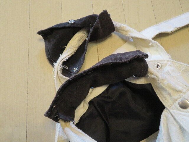 持ち手の見苦しい部分は、着られなくなったジーンズの裾の生地にスナップボタンをつけて取り外しできるようにしたものをつけて隠しています。