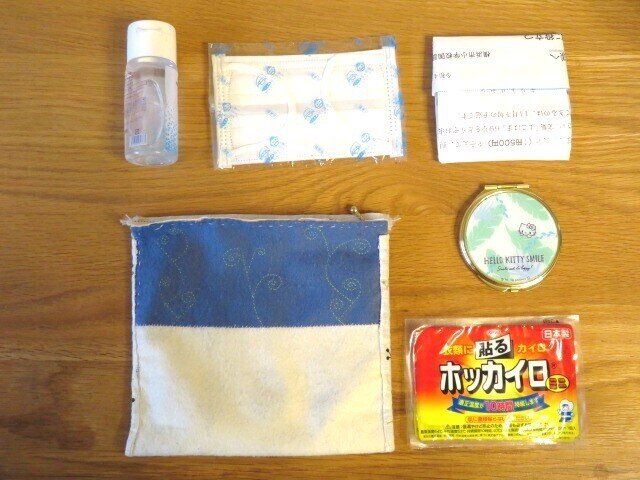 中身は左上から右下にかけて、消毒液、子ども用予備マスク、大人用予備マスク(裏紙に包んで折ってある)、手鏡、使い捨てカイロ(寒い時のみ)。