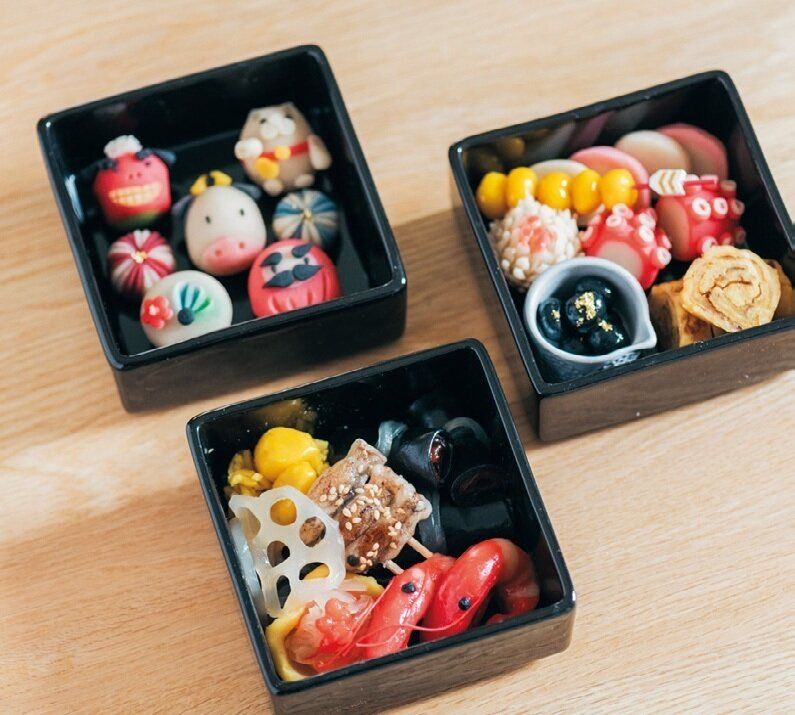 おせちの三段重は、まさかのすべて和菓子です。えびやれんこん、伊達巻きもすべて、白あんにぎゅうひを練り込んだ練り切りと羊かんでできています。