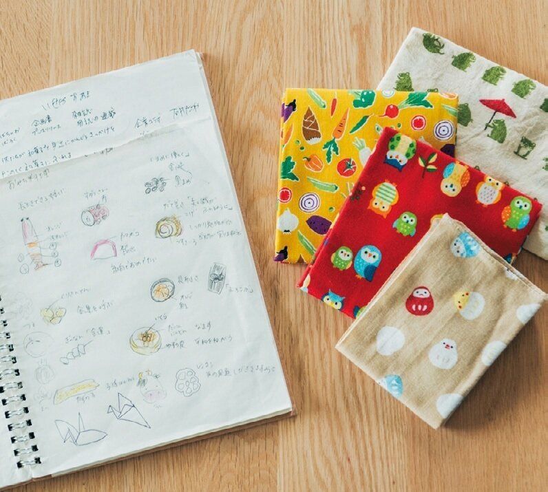 洋裁もするので、手芸店さんにもよく行きますが、生地の柄が、和菓子作りのヒントになることも。ノートに絵を描いて、仕上がりをイメージ。